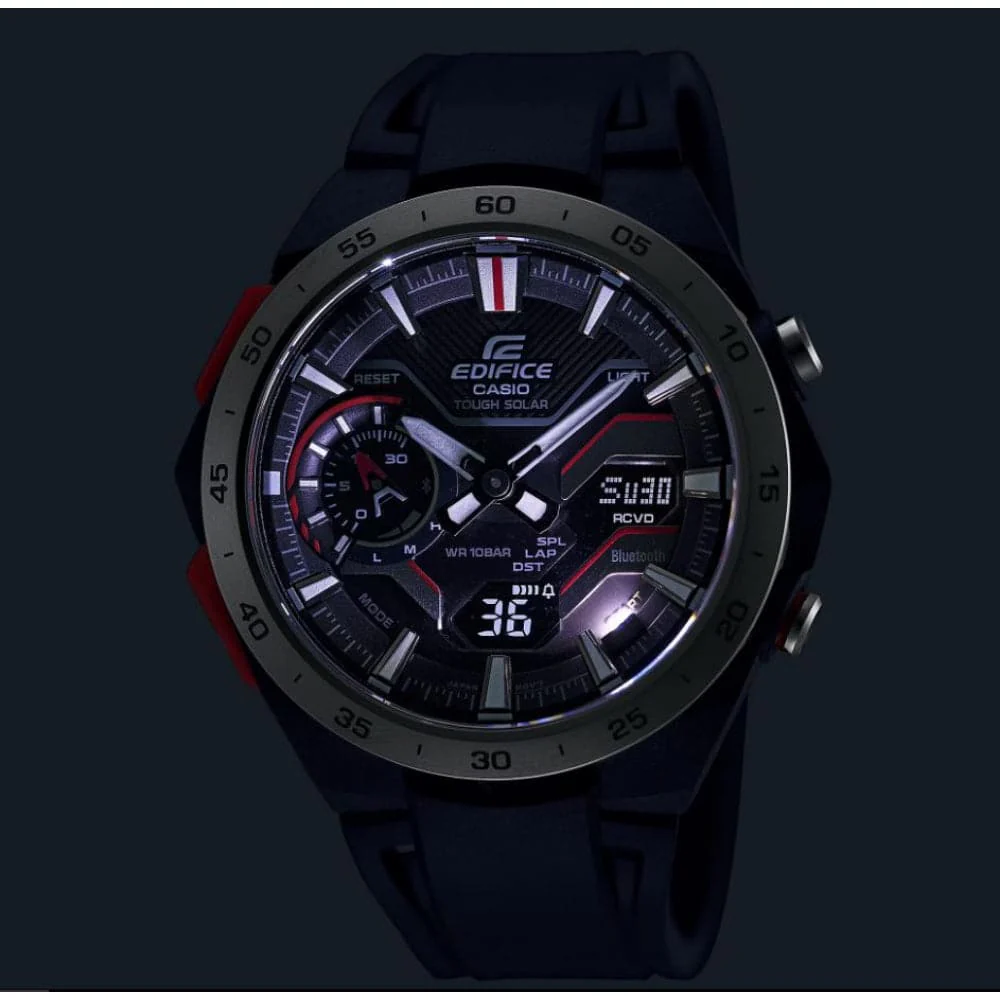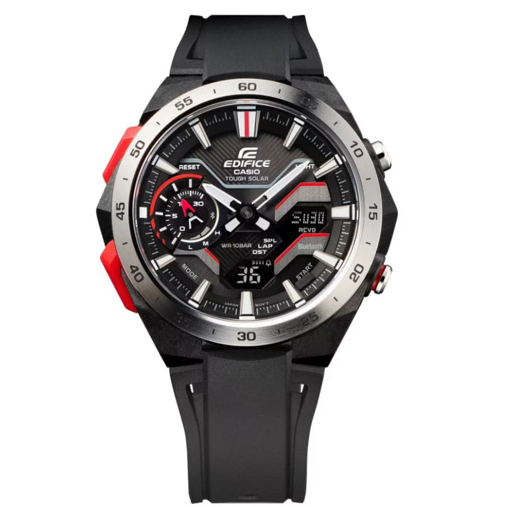 Feel the pure rush of a formula race car tearing up the track, with the EDIFICE WINDFLOW ECB-2200P, a digital-analog combination chronograph inspired by the racetrack.