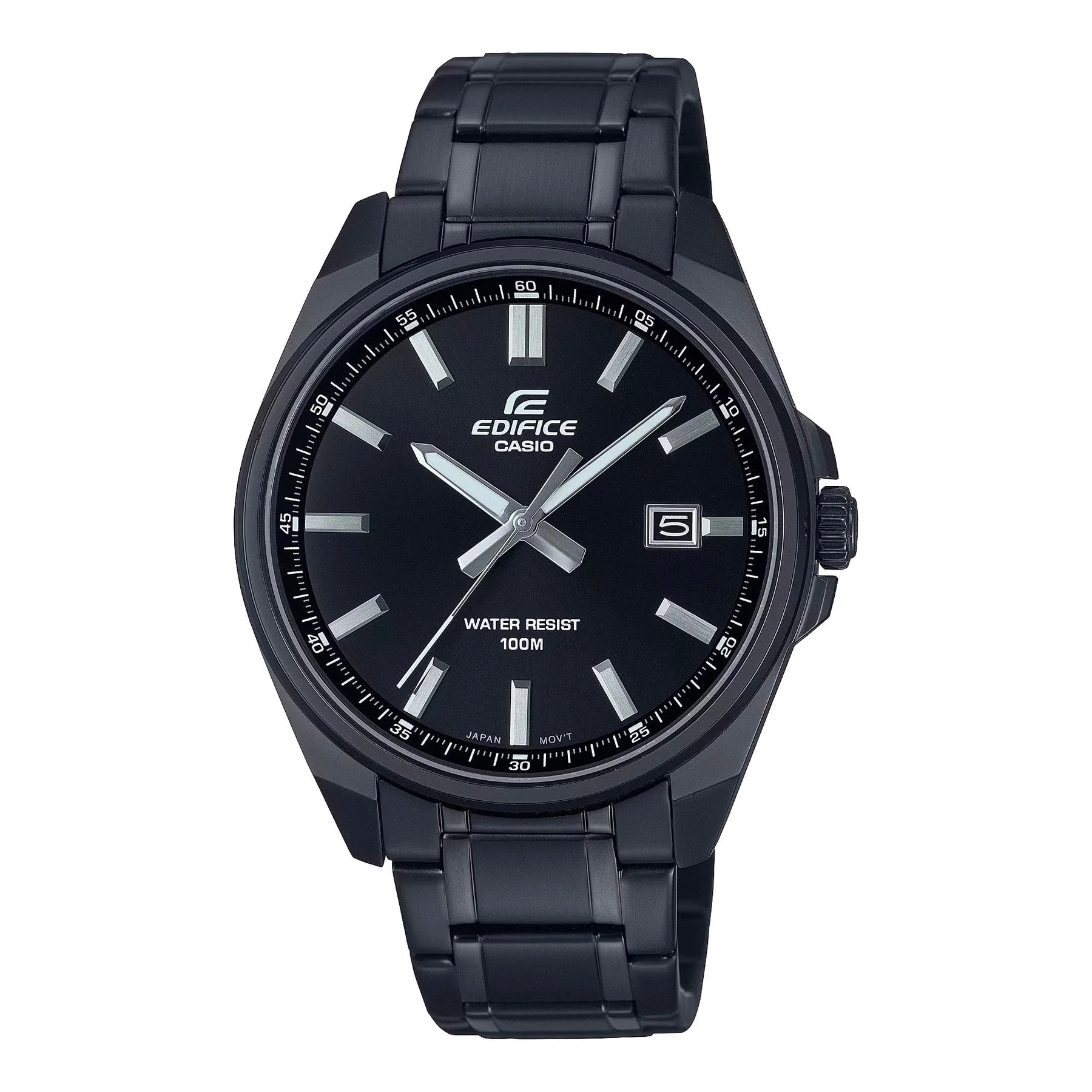 Crafted for precision and designed with bold sophistication, the Casio Edifice EFV150DC-1A men’s watch features a sleek black ion-plated stainless steel band and case, paired with a minimalist black dial. As part of the premium watches category, it blends robust engineering with refined style, making it ideal for any occasion. The 46.5mm stainless steel case houses a mineral crystal glass that resists scratches, while the 100-meter water resistance ensures dependable performance from boardrooms to outdoor adventures. Powered by a reliable quartz movement with ±20 seconds per month accuracy, it includes a date display and screw lock back for added durability. With a comfortable fit for wrist sizes between 150 to 205 mm, this timepiece delivers a polished, modern look with enduring functionality. A signature piece in men’s watch collections, it embodies the perfect balance of elegance and resilience.