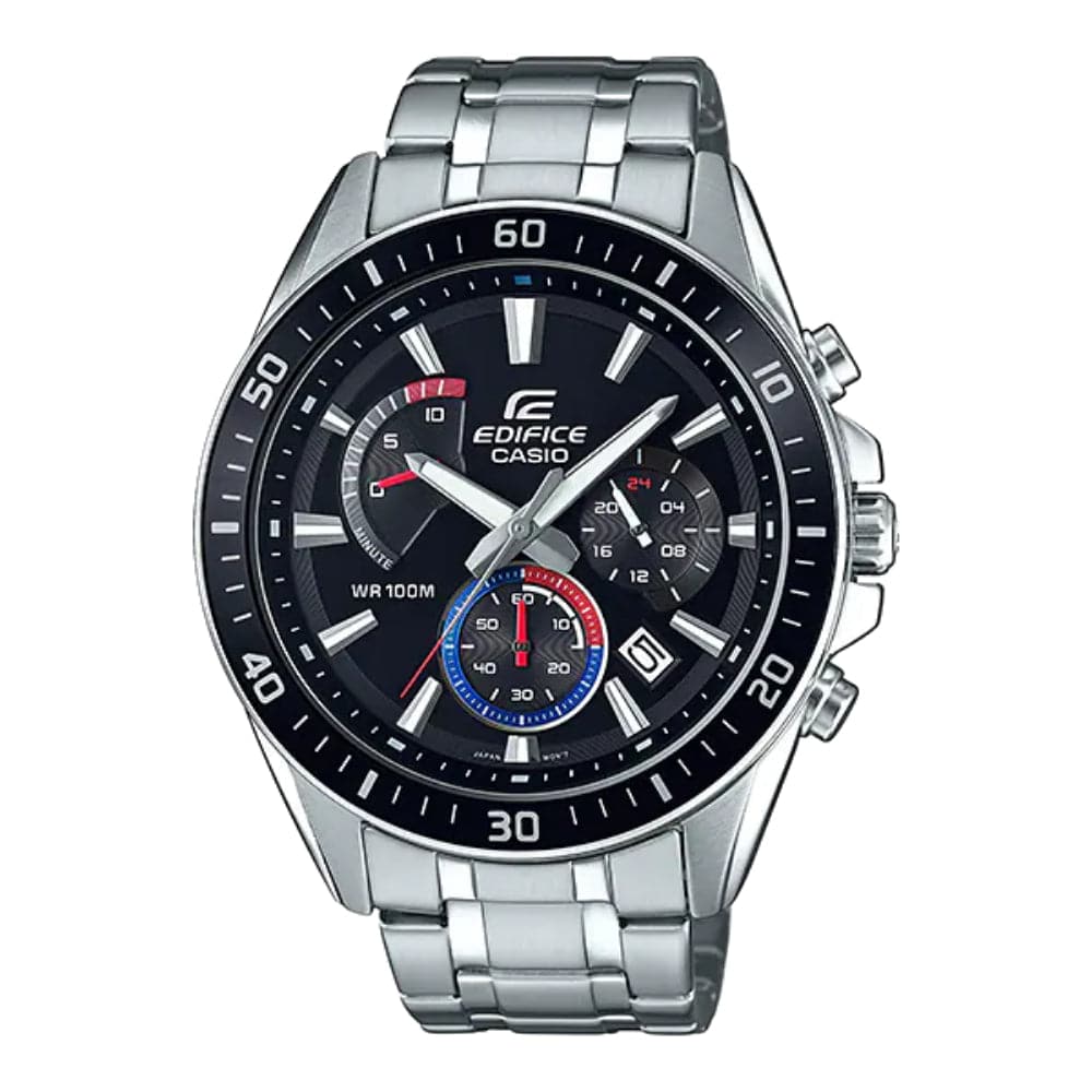 A large standard EDIFICE chronograph. Features a retrograde at the 10 o’clock position. Red and blue accents are added to the black bezel and dial to create a sporty design.