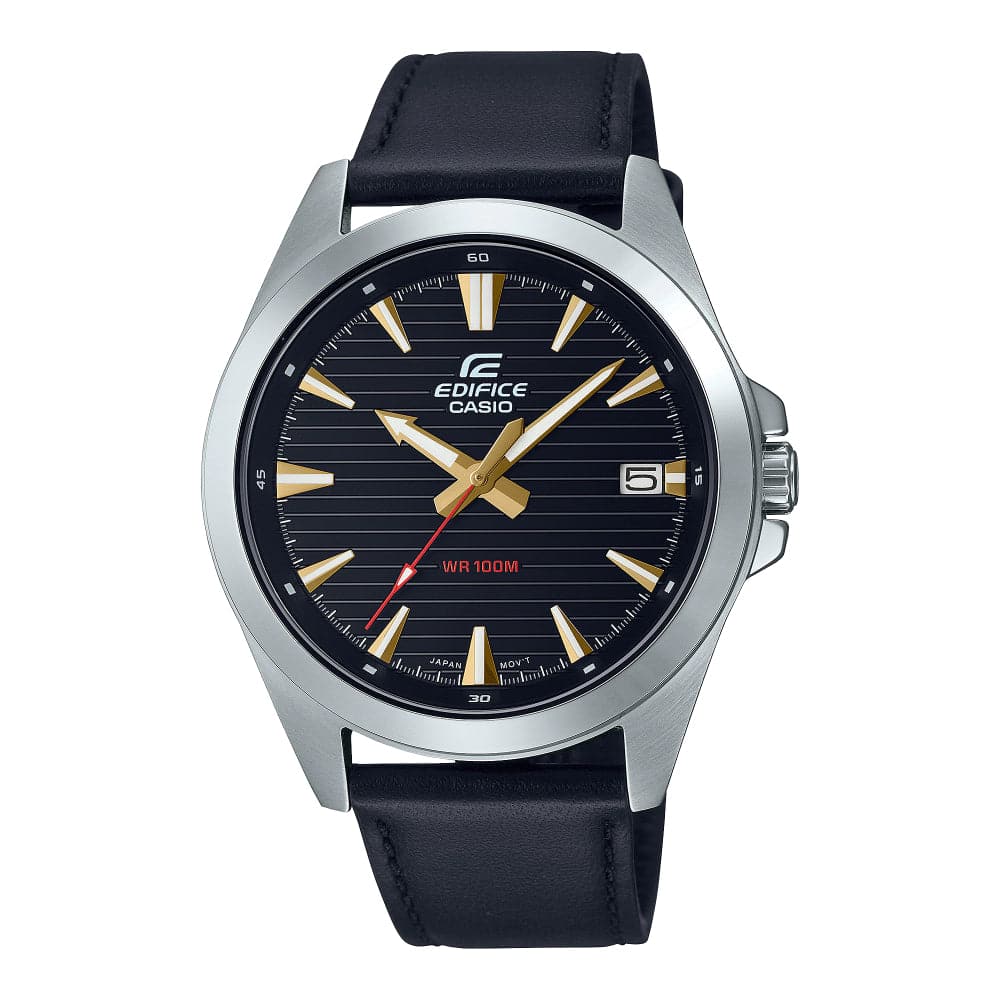 Welcome to the EDIFICE EFV-140L — a classic three-hand analog timepiece in a simple, yet sporty design with genuine leather band for a touch of style.