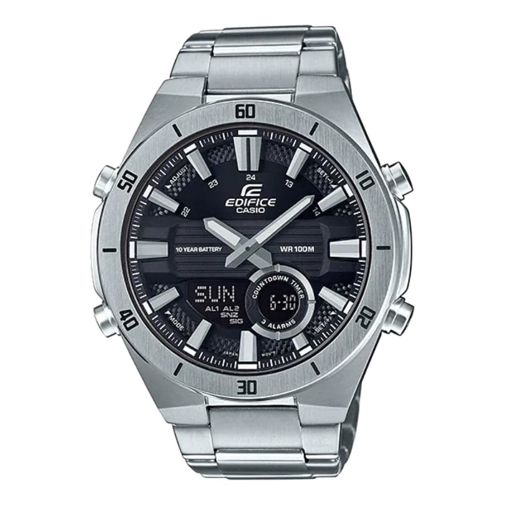 10-year Battery Life | A digital/analog combination model equipped with a long-life battery. A multi-functional model that displays not only a calendar but also world time, a 1/100 second stopwatch, and a countdown timer, etc. on an LCD screen. An extra-thick index design and three-dimensional dial produce a sporty design, while the hairline finish flat bezel creates a high-quality effect.