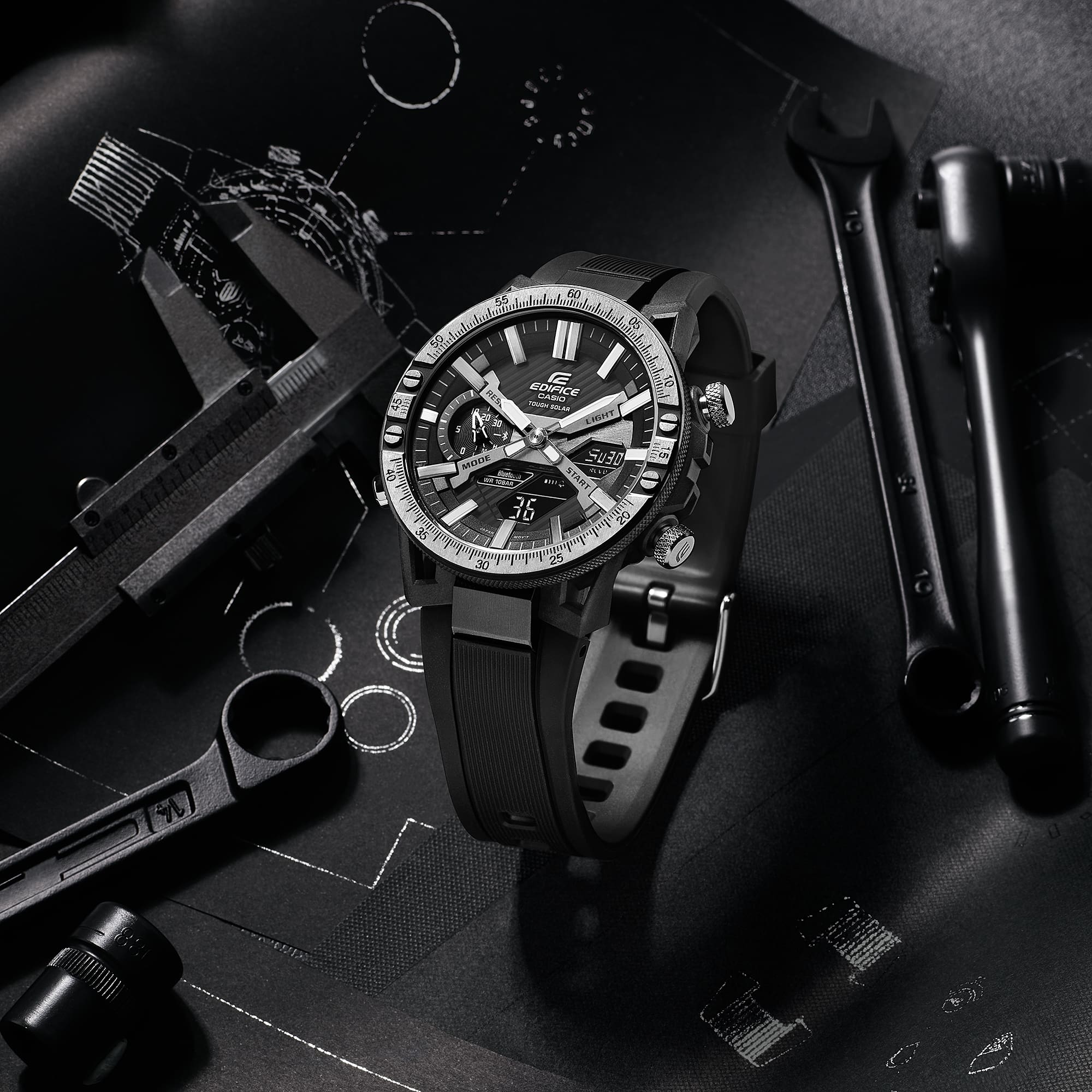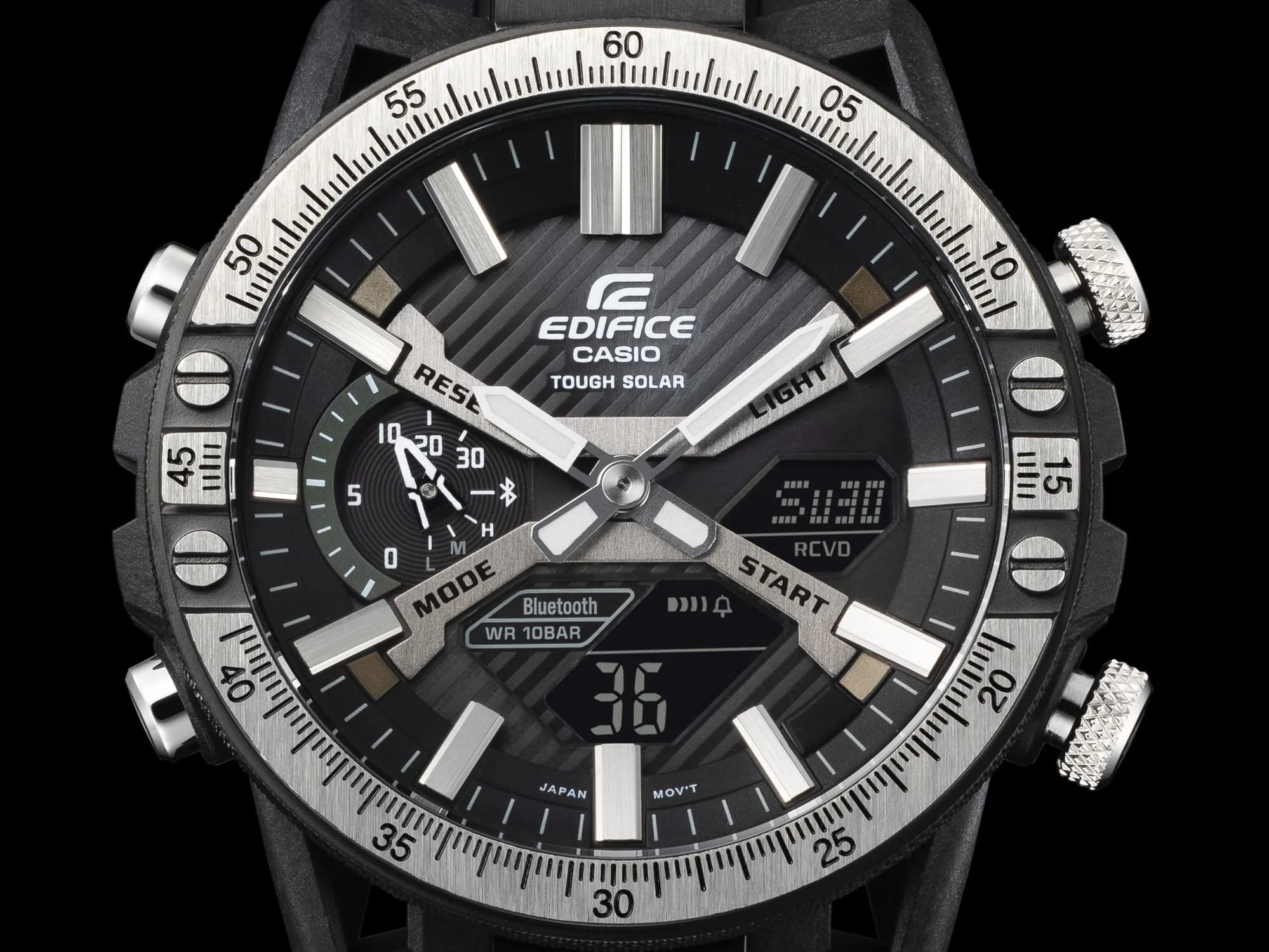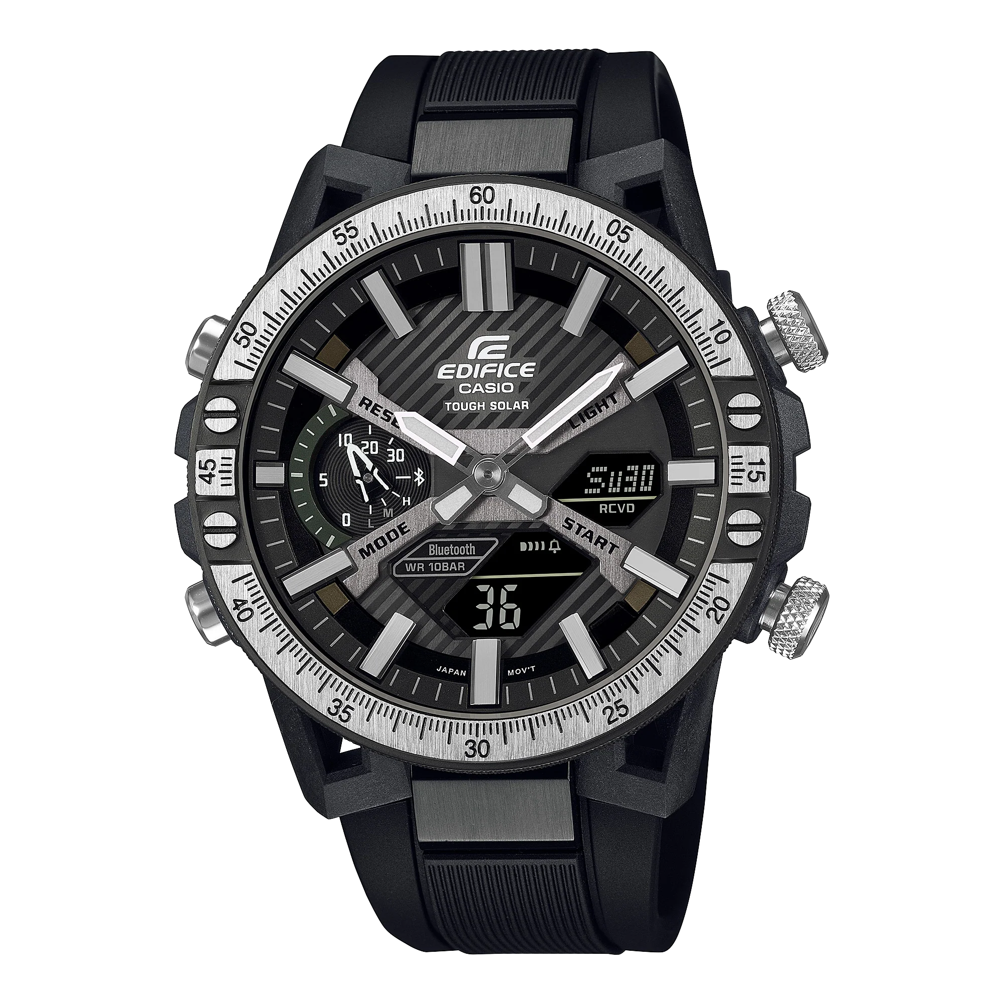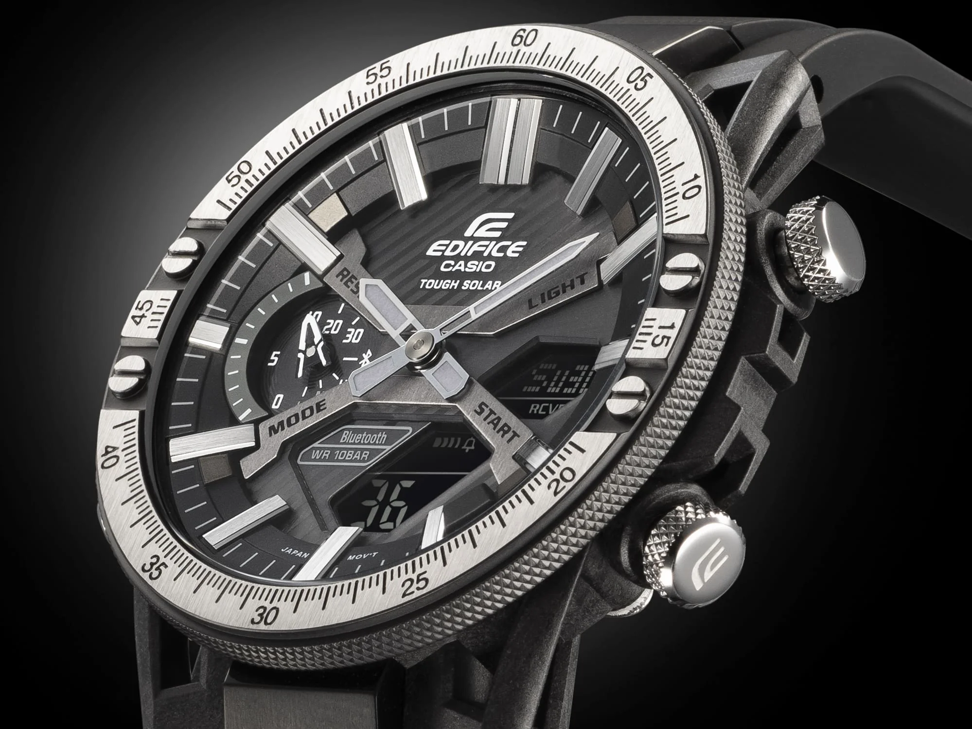 The Casio Edifice Sospensione ECB2000TP-1A blends cutting-edge engineering with refined design, offering a bold statement for the modern man. Crafted with a durable black resin band and a carbon-stainless steel case, this men’s watch showcases a black ion-plated bezel and mineral glass for lasting clarity and strength. Smart functionality meets sporty elegance through Bluetooth® smartphone linking, solar-powered movement, and world time in 38 zones. The multi-functional digital and analog display includes 1/100-second stopwatch, countdown timer, daily alarms, and automatic calendar—all housed in a sleek 51mm frame with 100-meter water resistance. Perfectly suited to the watches category, it stands apart with its blend of rugged materials and intelligent features.