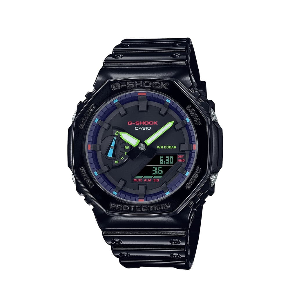 Venture into the Virtual Rainbow lineup — explore the colorful spectrum that emerges when the cybertech game-world aesthetic meets the G-SHOCK quest for the ultimate toughness. The bezels and bands bring in glossy black, while the faces feature rainbow vapor deposition and multicolored designs.