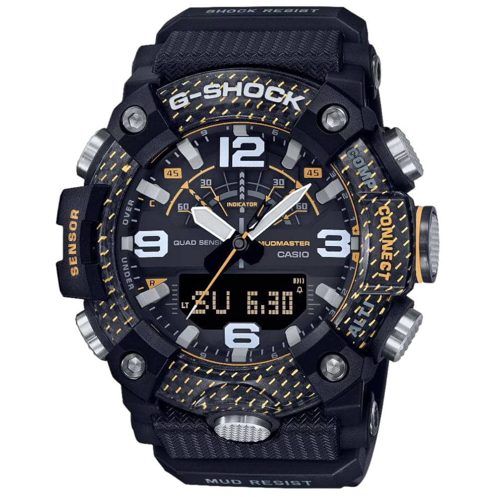 The GG-B100 MUDMASTER employs high rigidity carbon in the case to keep damage and warping at bay and ensure extreme airtightness and shock resistance. This timepiece also features a filter to protect against mud, a stainless steel panel back, and a back cover made of shock-resistant fine resin embedded with glass fibers, giving it a high level of resistance to dust and mud. The bezel also uses three layers of fine resin with carbon fiber inserts. This tough, rugged design is accented in bright bold yellow.