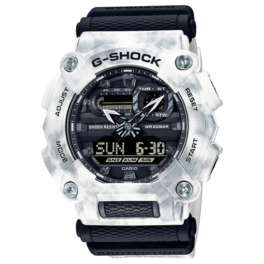 Frozen Forest timepieces feature digital snowflakes in a camouflage pattern against wintry white for a frosty texture that’s stylishly cool.