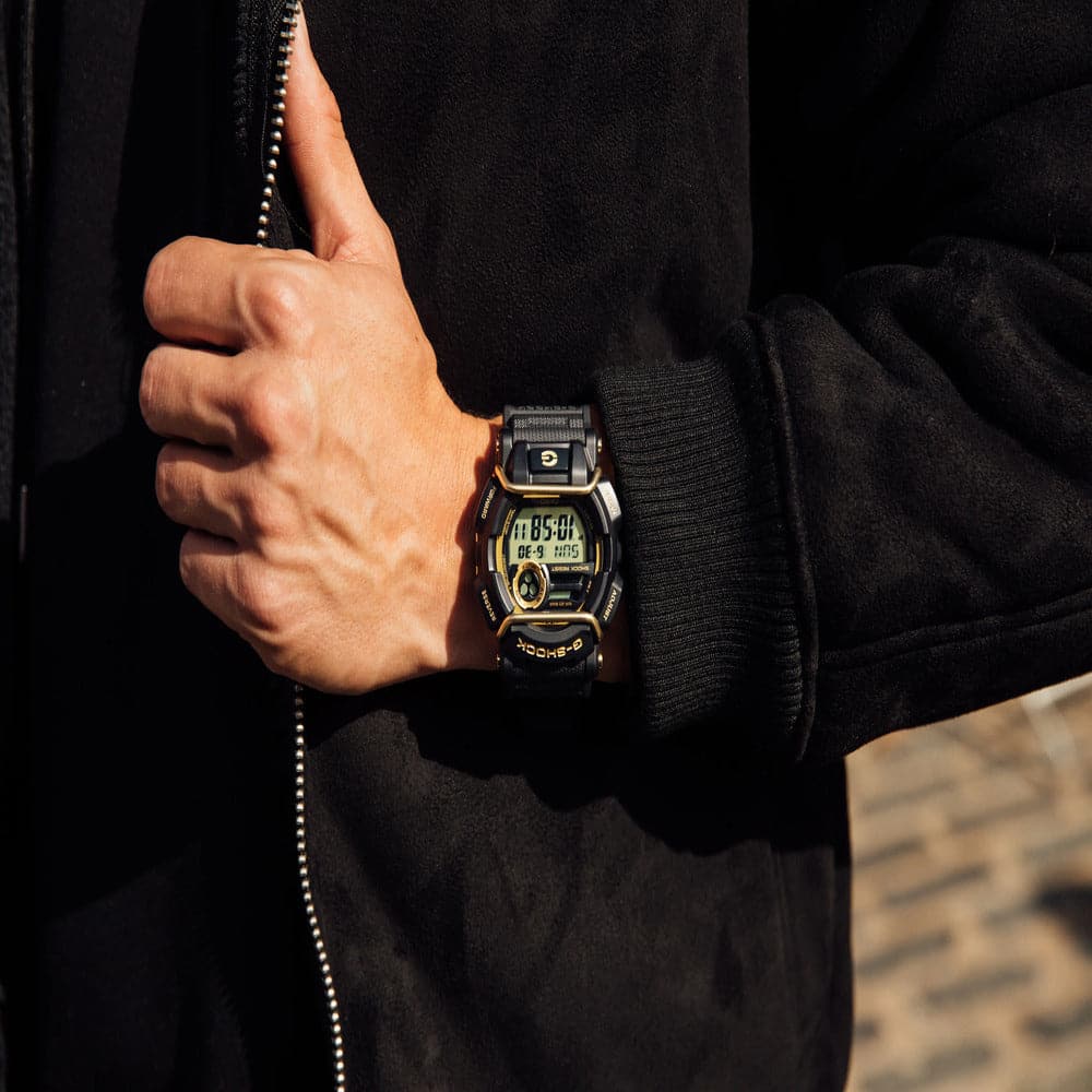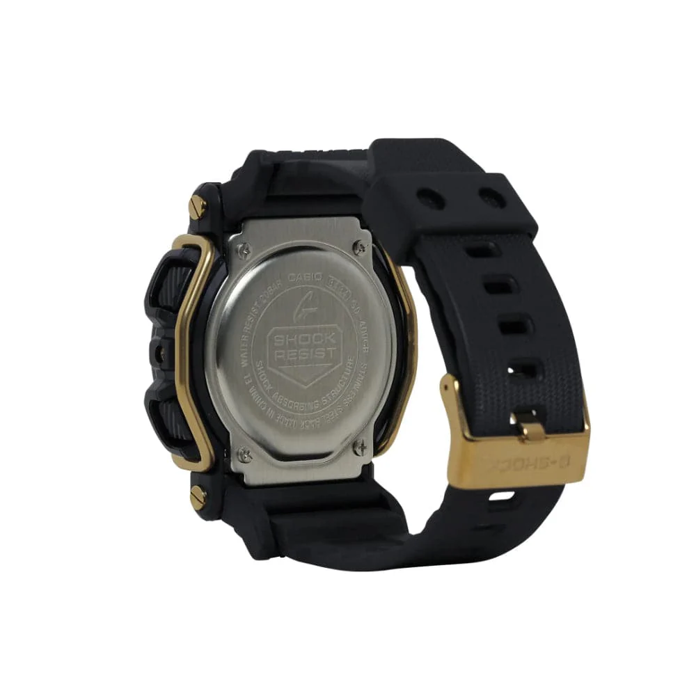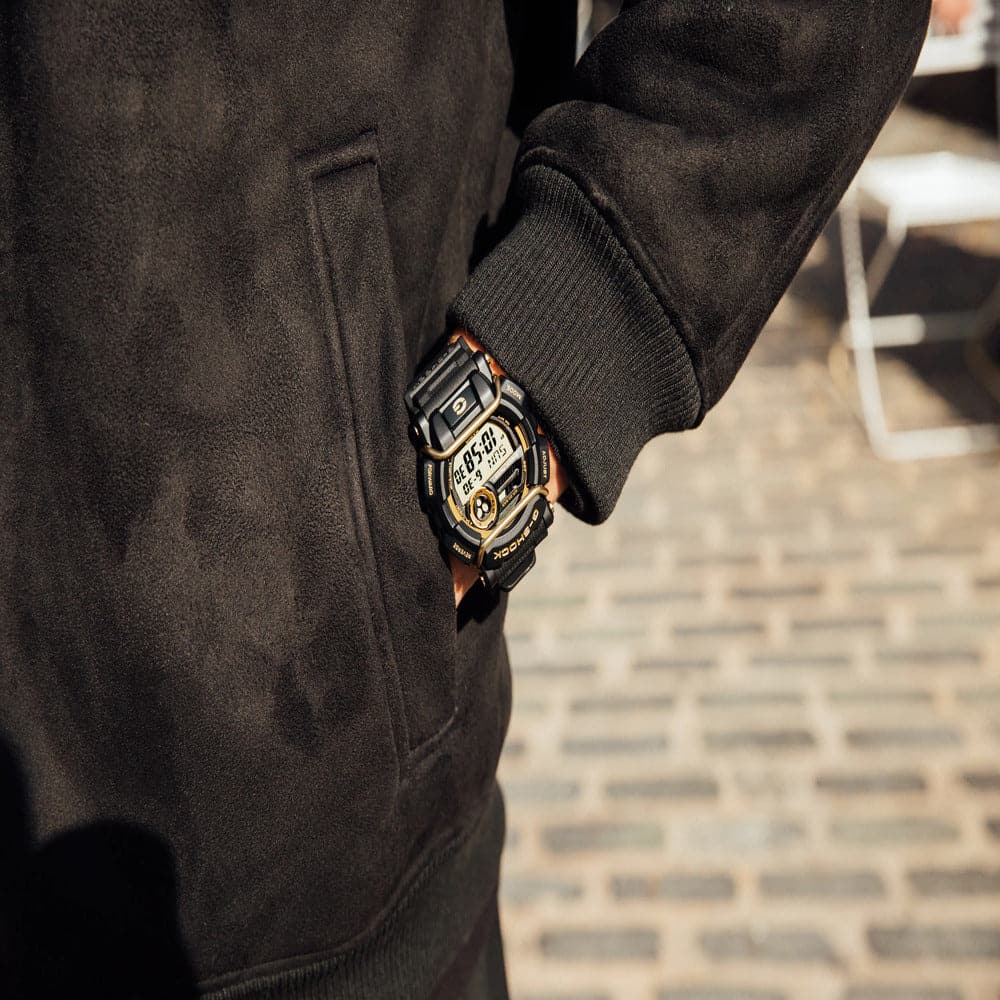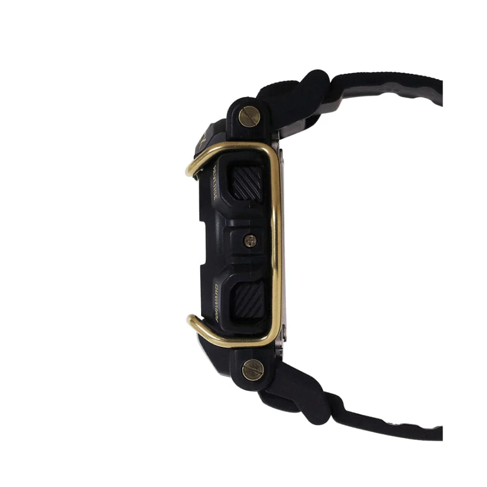 Basic G-SHOCK black is accented in gold to create a HIP-HOP artist or B-BOY fashion item motif. Black with gold, which are employed in a large number of accessories, is used on the case, band, and face, for a boldly cool design.