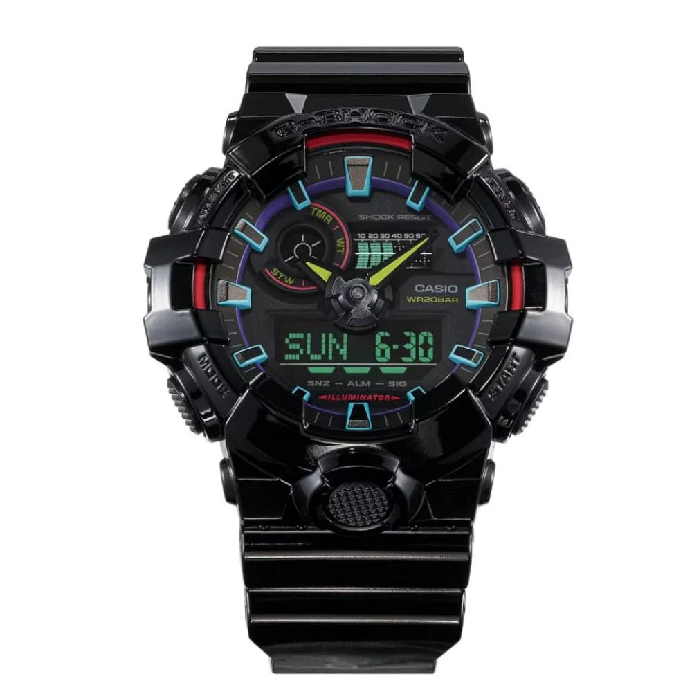 The bezels and bands bring in glossy black, while the faces feature rainbow vapor deposition and multicolored designs. The result is a range of bold looks in prisms of cool color lighting up the darkness, which crushes in any fashion scene.