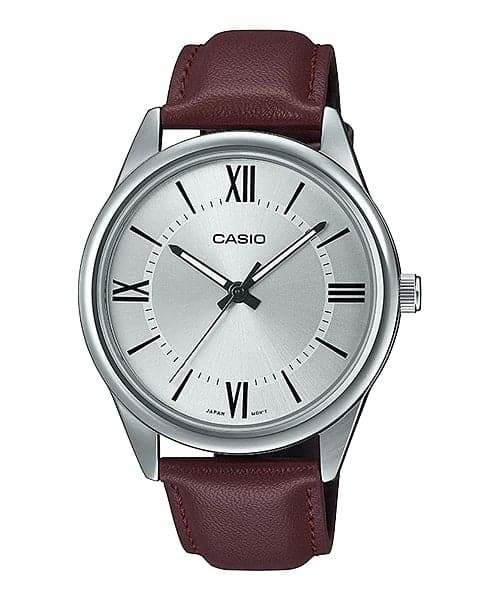 Style yourself for work or play with the MTP-V005 line of Casio dress watches. The simple, clean design of the face makes it easy to be on time. These versatile timepieces are water resistant for daily use, freeing you from worry when out in the rain or washing up. Build your own—just choose Arabic or Roman numerals, metal link or leather band, dark or light watch face, and you’ll have a handsome timepiece that projects your personal brand.