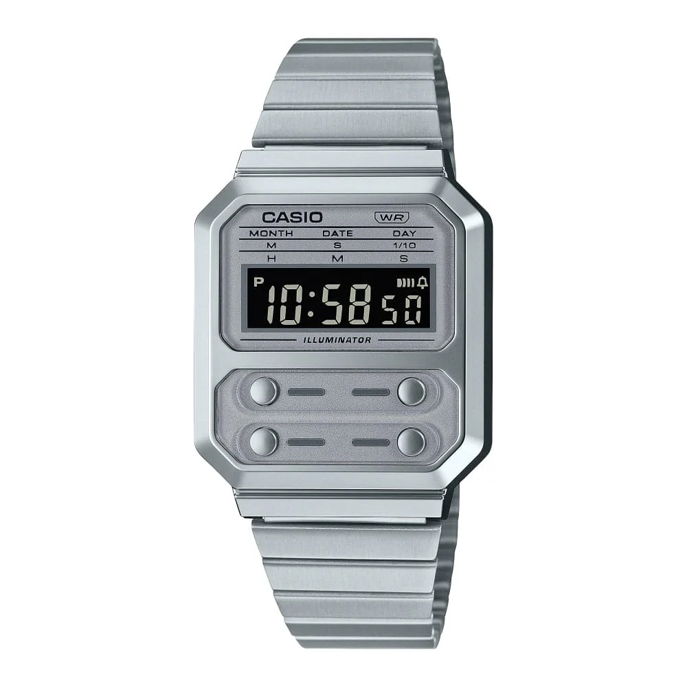 Paying homage to the F-100, the first Casio watch designed with a resin case, the A-100 line commemorates the iconic four front buttons, adding vintage-style metallic components for an updated reboot of a true classic.