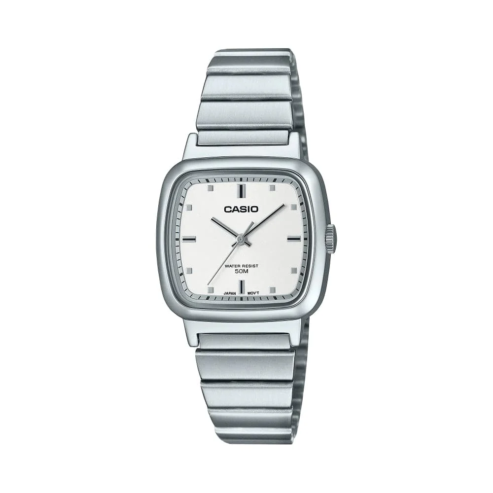 Shimmering bar indexes are set against a tasteful face color for a chic and elegant design. Water resistance up to 50 meters frees you from worry on rainy days and when washing up.