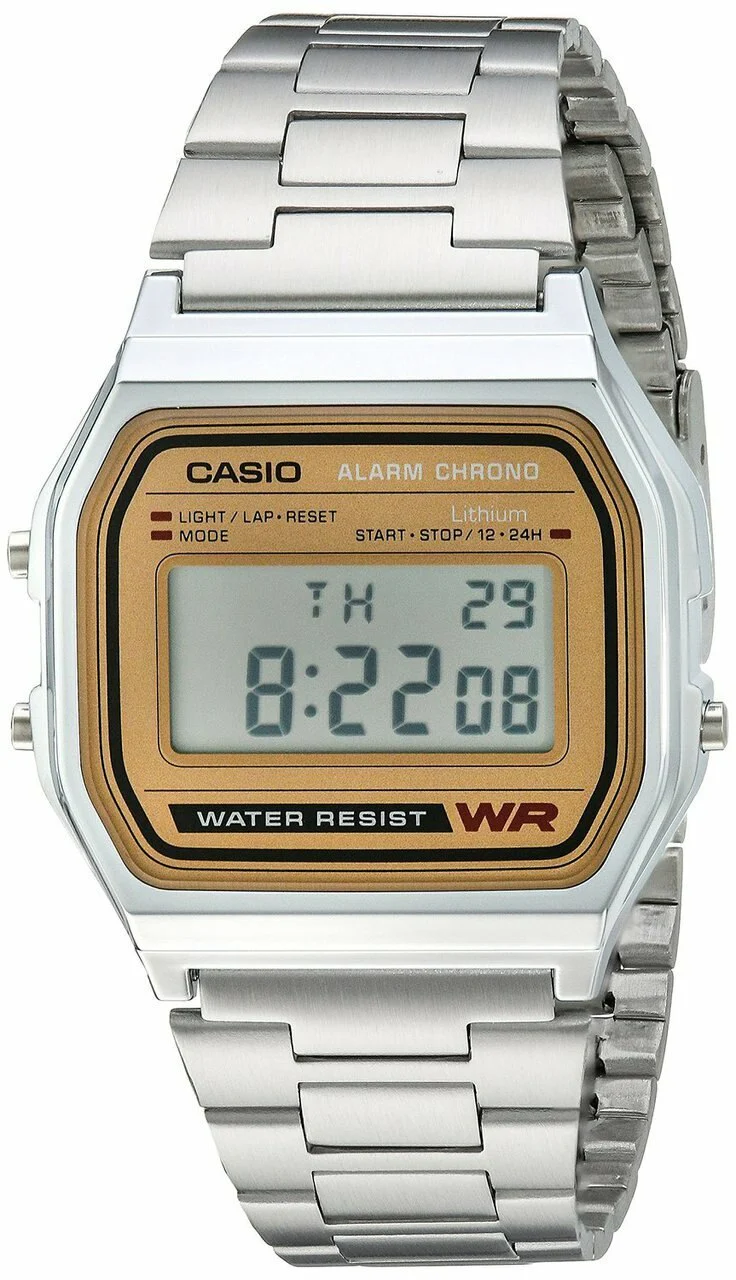 Casio A158WEA-9 Classic Casual chronograph alarm unisex watch features a 33mm wide and 8mm thick solid stainless steel case with a fixed bezel and function pushers. Casio A158WEA-9 is powered by a reliable quartz chronograph movement. This attractive watch also features a grey digital dial with the day and date display function. This stylish watch also features chronograph, alarm, micro light, auto calendar; 1/100 second stopwatch, protected by scratch resistant mineral crystal and water resistant depth is 30 meters. Casio A158WEA-9 is equipped with a 19mm wide solid stainless steel bracelet with a fold over deployant safety clasp. Casio A158WEA-9 unisex Classic Casual digital dial bracelet chronograph alarm watch is brand new and comes in an original Casio gift box and is backed by a 1 year limited warranty.