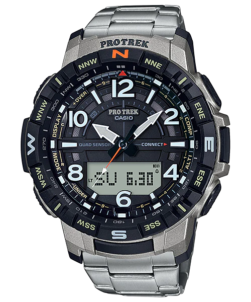 A PRT-B50 equipped with a smartphone link function in addition to a quad sensor able to measure number of steps, direction, altitude/barometric pressure, and temperature. Lightweight and rust-resistant titanium is used for the band material, making the watch suitable for everyday use as well as the outdoors. The monotone colour scheme is accented by colouring the second hand and the letter “N,” indicating north, on the large rotating bezel, orange. Large Arabic characters are included on the three-dimensional dial to improve visibility.