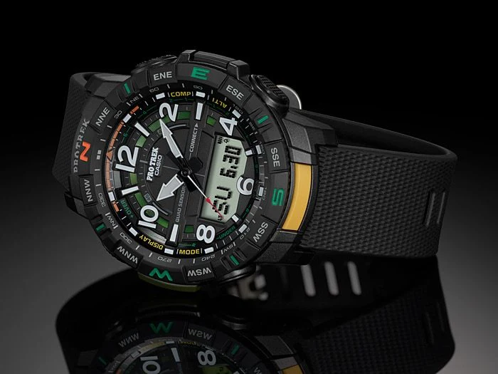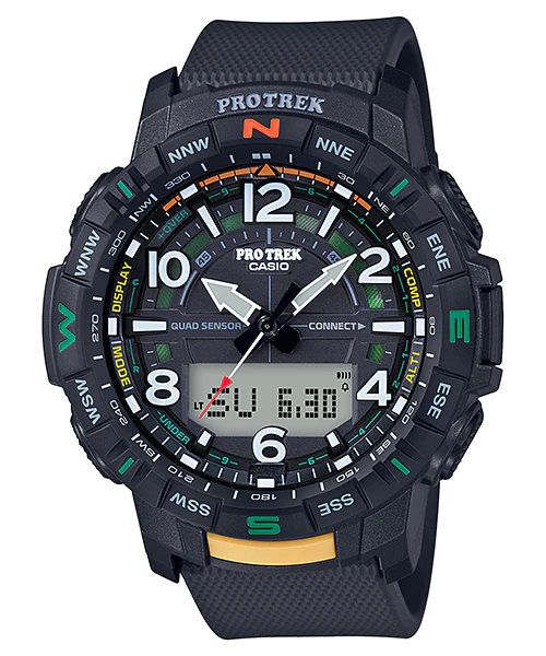 Casio Pro Trek Quad Sensor Mens Watch PRTB50-1D is designed with peak performance in mind, bringing together the latest technology and innovative designs to provide outdoor adventurers the ultimate timepiece experience. Along with Quad Sensor features (Thermometer, Altimeter/Barometer, Digital compass, and Step counter), the Bluetooth® capabilities enable data communication with a connected smartphone, while the Hand retraction function, Sunrise/sunset time display, World Time (City Swapping) and Double LED Light (Auto Light) enhance performance even further.