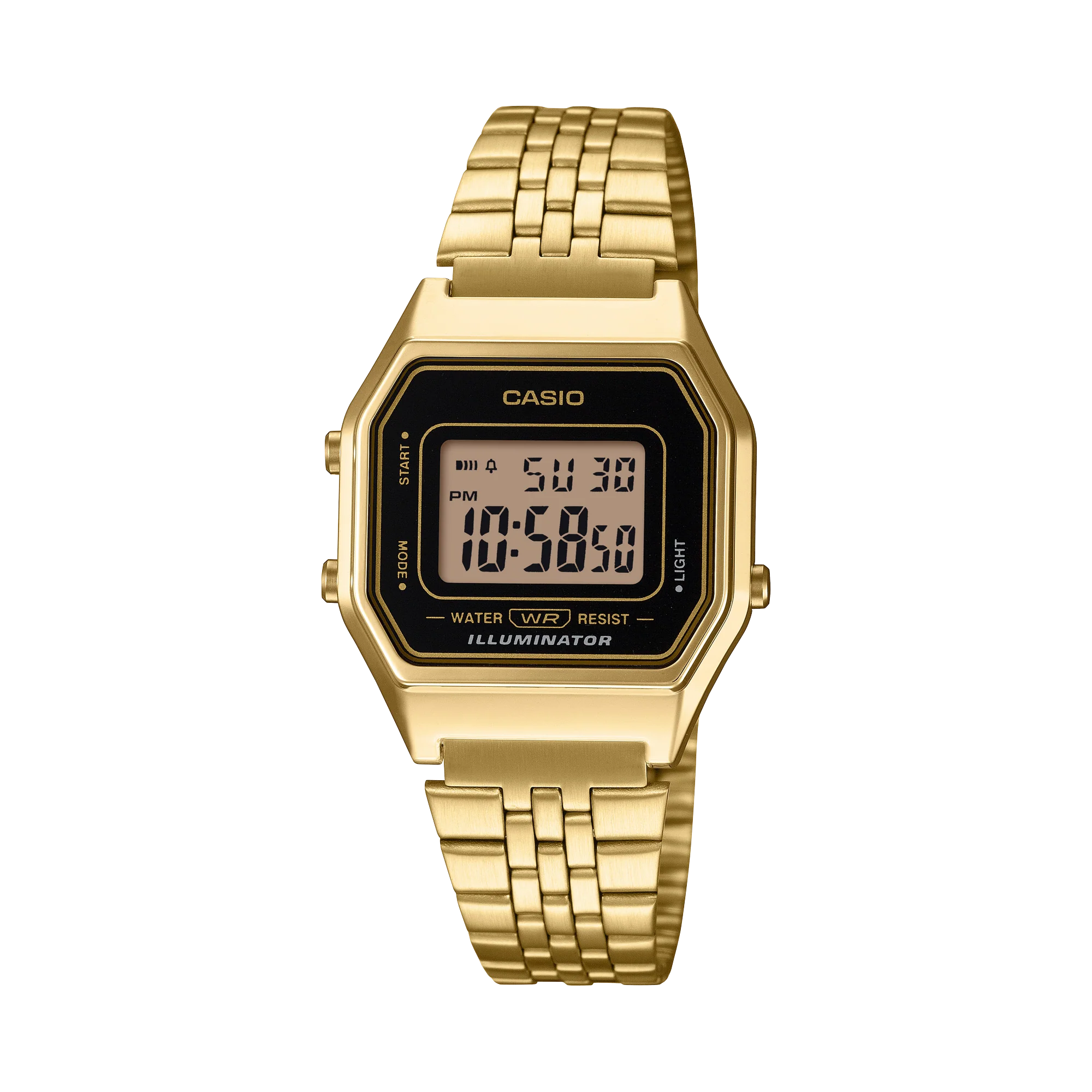 Casio embraces timeless refinement with the LA680WGA-1D, a gold-tone stainless steel band watch that pairs vintage charm with contemporary precision. The rectangular case measures about 3.35 cm long, 2.86 cm wide and 0.86 cm thick, framed by a sleek gold bezel and a resin glass face that guards a clear digital display. Inside, a precise quartz movement ensures dependable accuracy, while a 1/100-second stopwatch, daily alarm and amber LED backlight deliver practical versatility for everyday wear. Water resistant and finished with an adjustable clasp, this men’s watch or women’s watch exudes quiet luxury—an enduring Casio classic built for style and reliability.