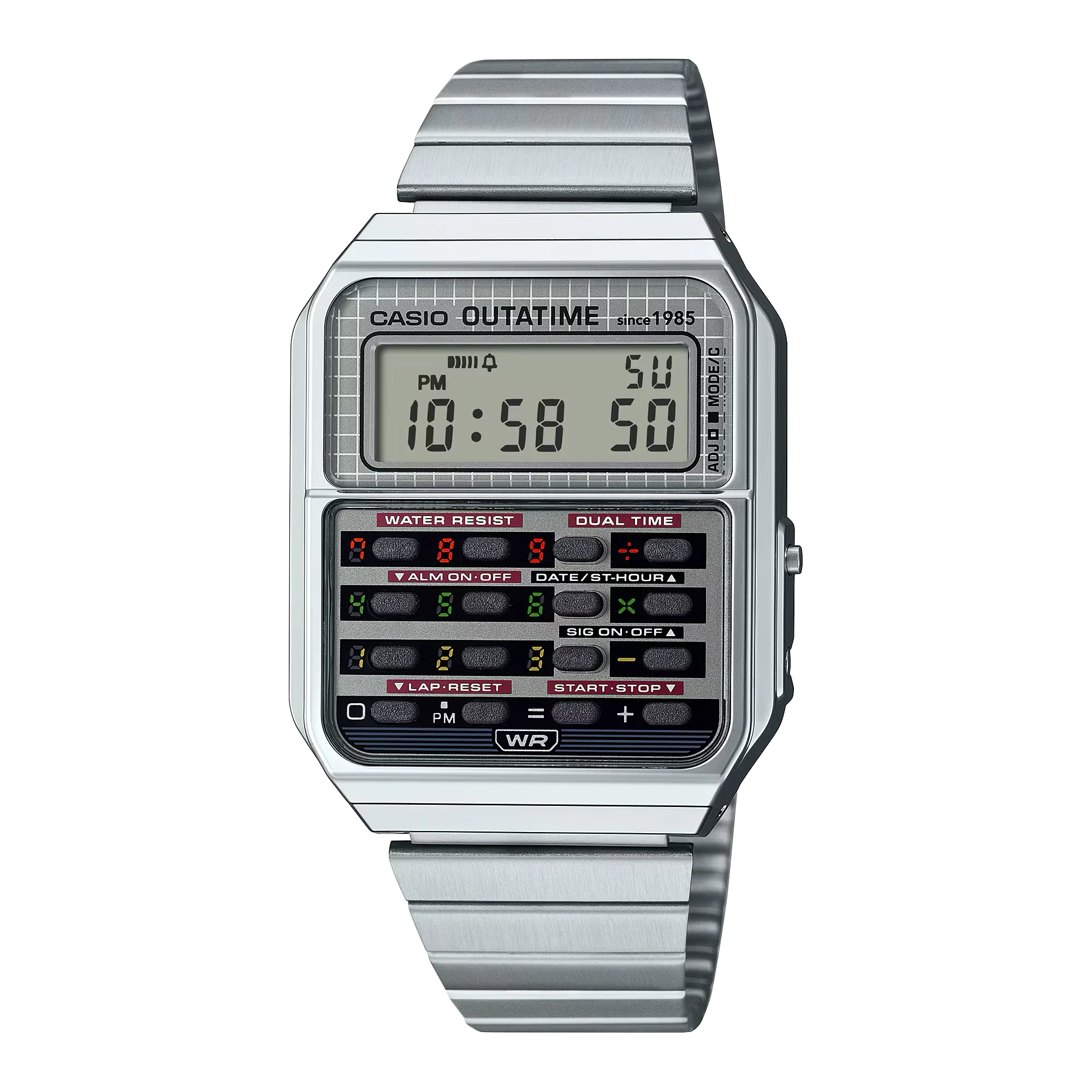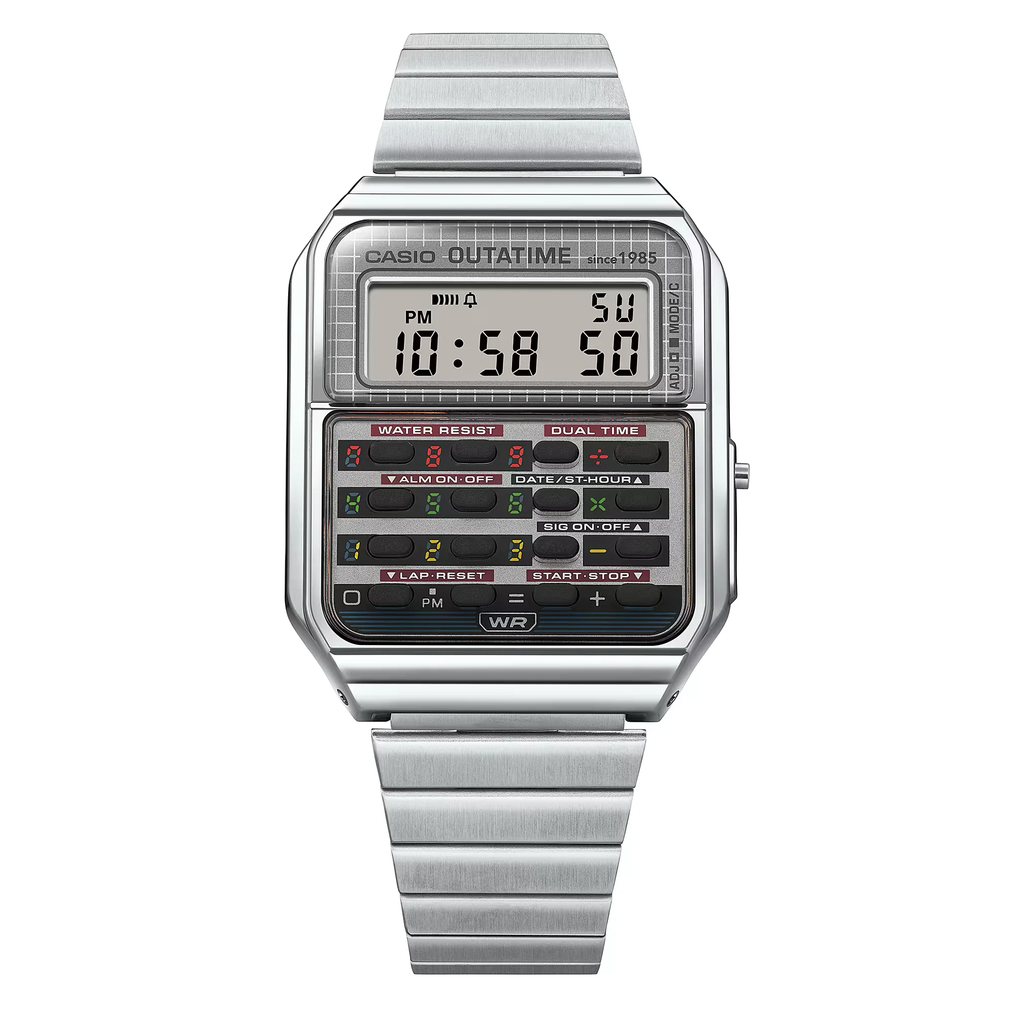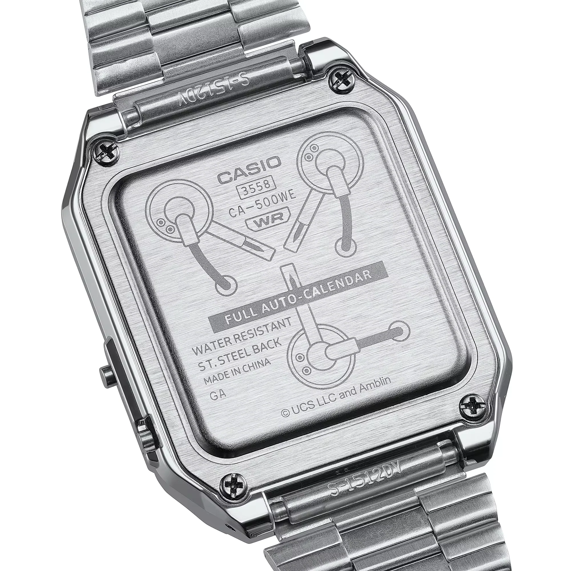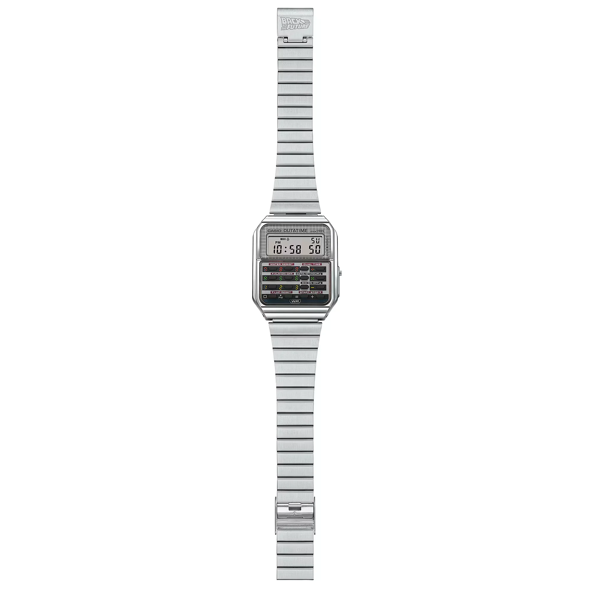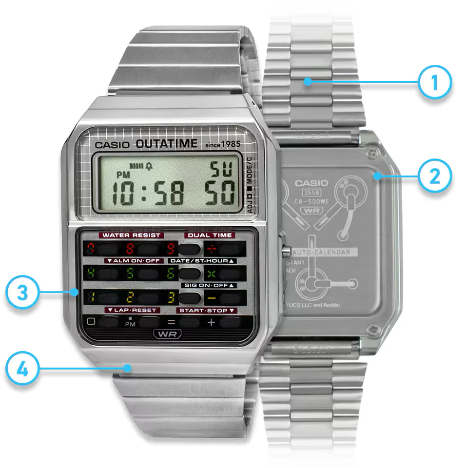 The CA-500, the ever-popular Casio calculator model, as loved now as it was in the 1980s, takes on a Back to the Future DeLorean theme. The different colors around the buttons evoke the DeLorean’s time circuits for setting the destination date and time, transporting you into the world of the film every time. The case back is engraved with the flux capacitor, the iconic piece of fictional technology that turns the DeLorean into a time machine.