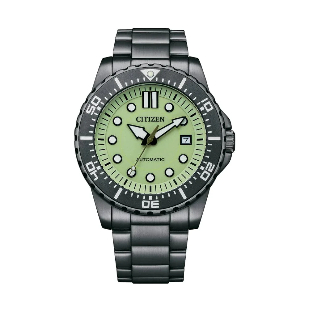 A classic watch with a modern touch. New from our Mechanical Collection, this contemporary design reflects Citizen’s craftsmanship and enduring quality. Featuring a 43mm black-tone stainless-steel case and matching bracelet, a green luminous dial for improved visibility and water resistance of up to 100 meters, making this the perfect timepiece for your everyday needs.