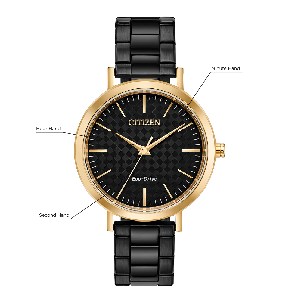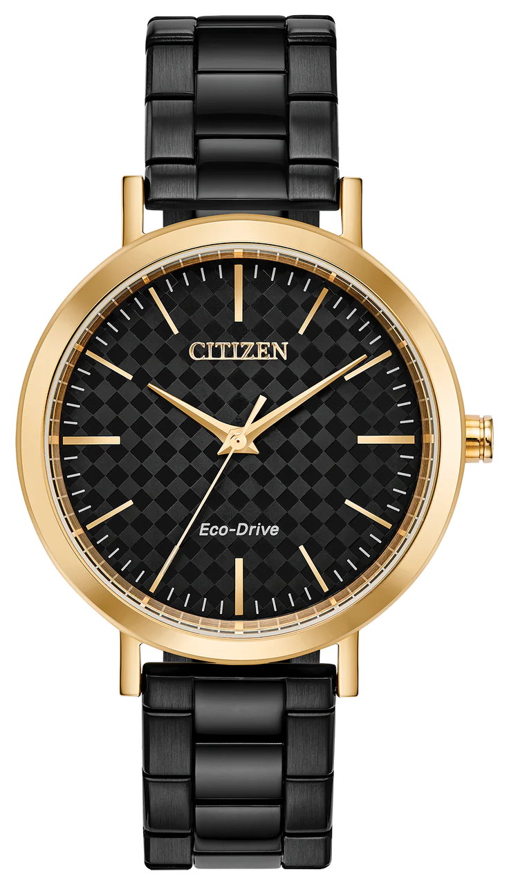 Make room in your watch collection for this modern timepiece. A fresh staple to your every day watch wearing with clean lines and simplistic detailing. Featured here in a sleek black stainless steel bracelet, gold tone case and a unique checkered patterned black tone dial. This watch will ensure you are always on trend. Powered by our Eco-drive technology it never needs a battery, only a light source.