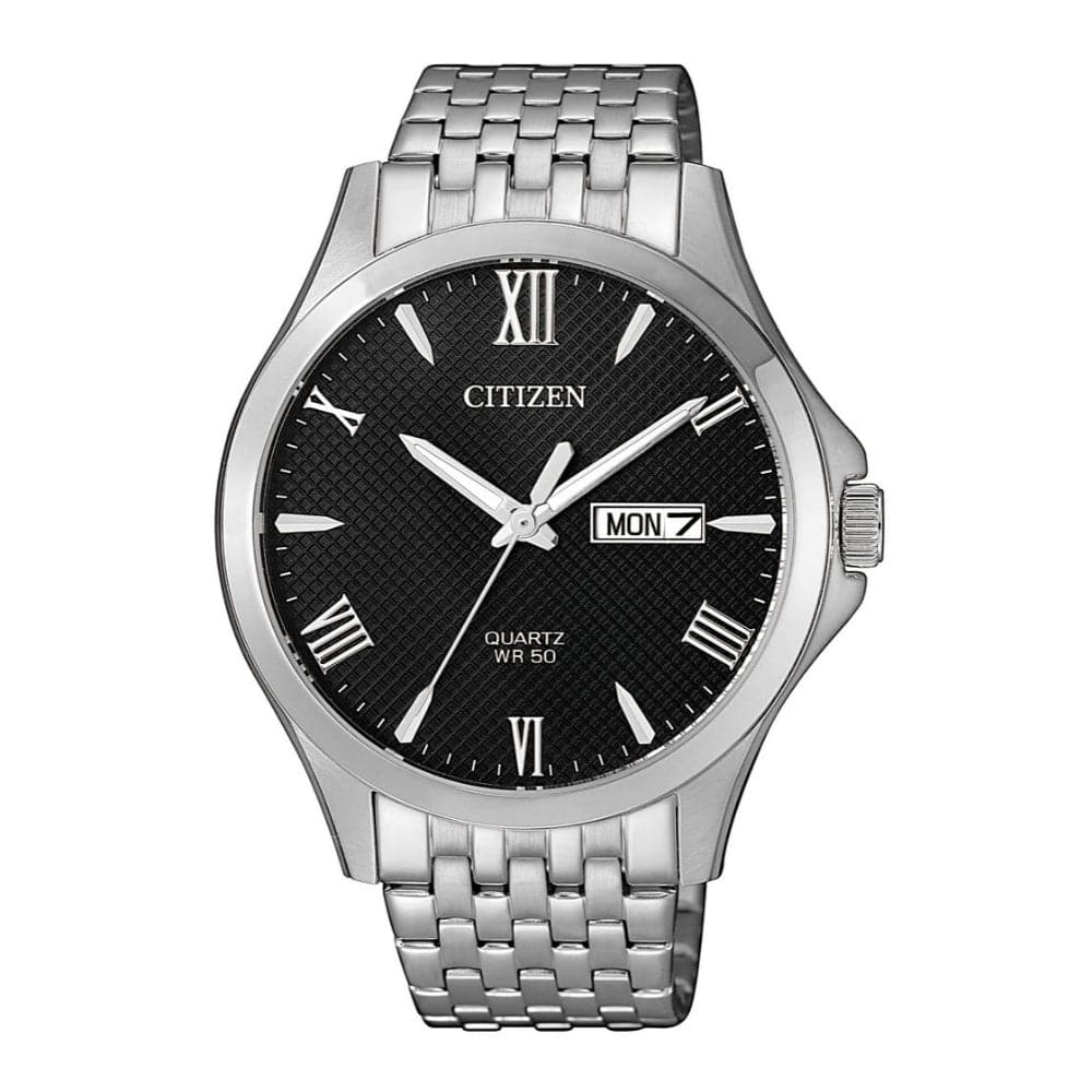 A classic comeback of the original wristwatch aesthetics that never fade off, the watch boosts a luxury patterned black dial with roman numerals and indexes alternating hour markers and large Day and Date display completing the classic feel. The watch is fitted with a soft multilink stainless-steel bracelet which rests gracefully on the wearer’s wrist. Citizen Quartz watches are powered by high precision Quartz movement, which is Made in Japan, they are extremely reliable and have very low Maintenance to give you accurate timekeeping effortlessly.