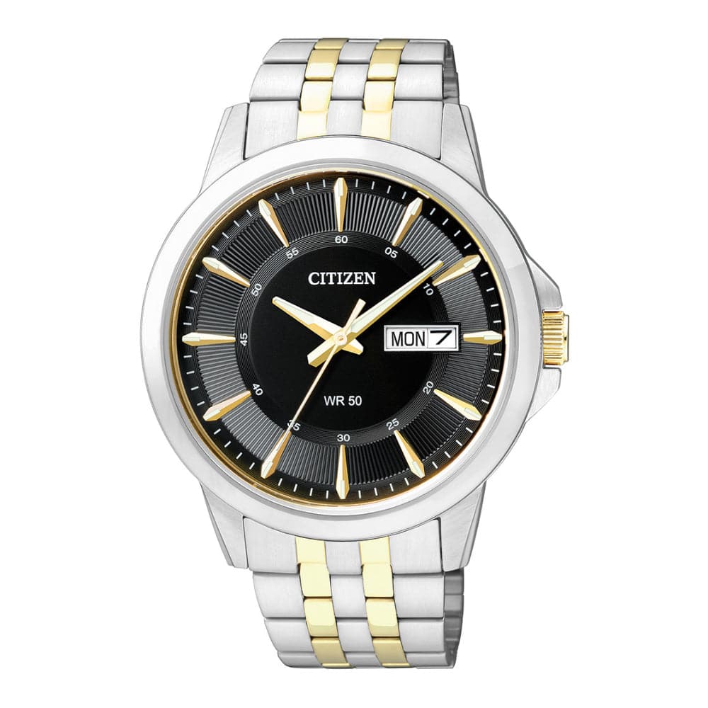 Come back to the originals, this Day and Date Citizen Quartz watch is a classic reinvention, the large Day and Date window, the circular pattern on the dial running along the minute tracker and the asymmetrical kite shaped indexes are the distinguishing features of this super popular style. Features a black dial and a two tone Stainless Steel multilink bracelet. Citizen Quartz watches are powered by high precision Quartz movement, which is Made in Japan, they are extremely reliable and have very low Maintenace to give you accurate timekeeping effortlessly.