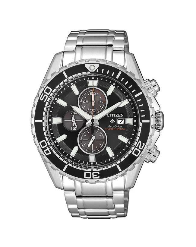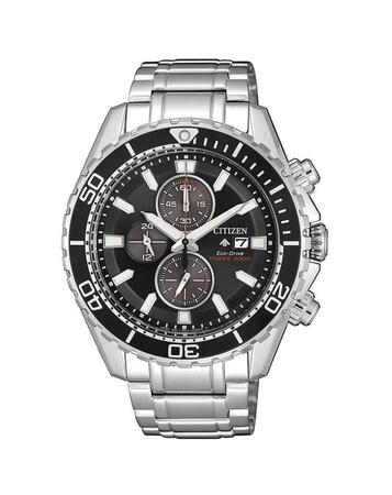 Proof that a dive watch can be fun & functional with the Citizen ISO-compliant Citizen Promaster Chrono Diver. With Eco-Drive technology, it is powered by light and never needs a battery, so you’ll never need to open your caseback or compromise your dive again. This timepiece features a stainless steel case and bracelet with black and black bezel and matching black dial, one-way rotating elapsed time, 1/5th-second chronograph, 12/24-hour time, date and diver 200M. Caliber number B612.