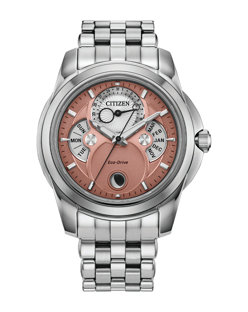 Refined and innovative, the Citizen Calendrier Moonphase watch blends iconic craftsmanship with contemporary design. Encased in silver-tone stainless steel, the 41.8mm case features a recessed crown and an intricately brushed five-link bracelet that enhances its modern silhouette. The multi-layered pink dial adds depth and elegance, displaying day, date, and month indicators along with a moonphase complication that elevates both function and sophistication. Powered by Citizen’s Eco-Drive quartz movement and protected by durable sapphire crystal, this men’s watch offers 100 meters of water resistance—ideal for everyday versatility. A seamless fusion of precision and style, it reflects the heritage of Citizen’s timekeeping excellence.