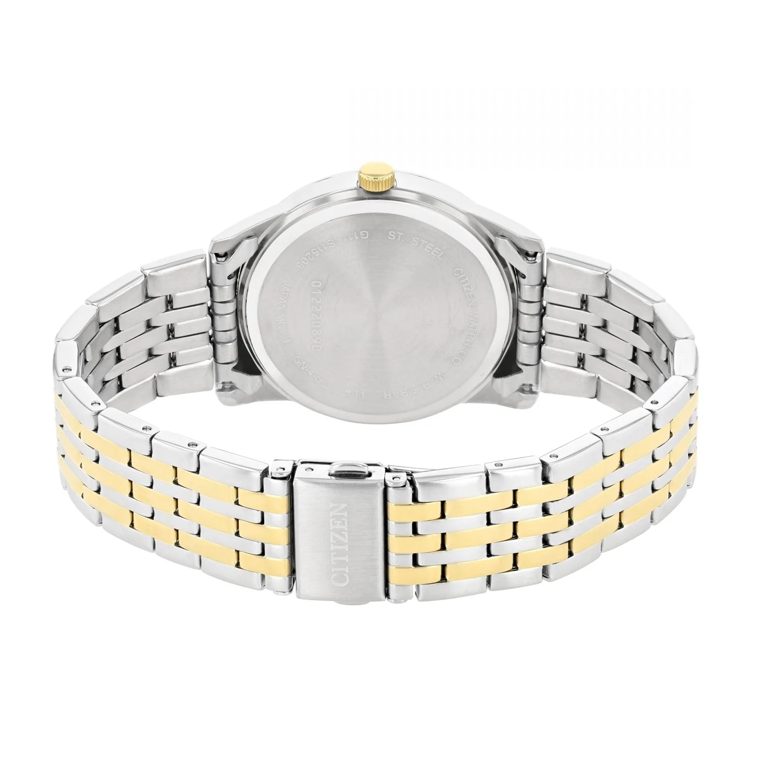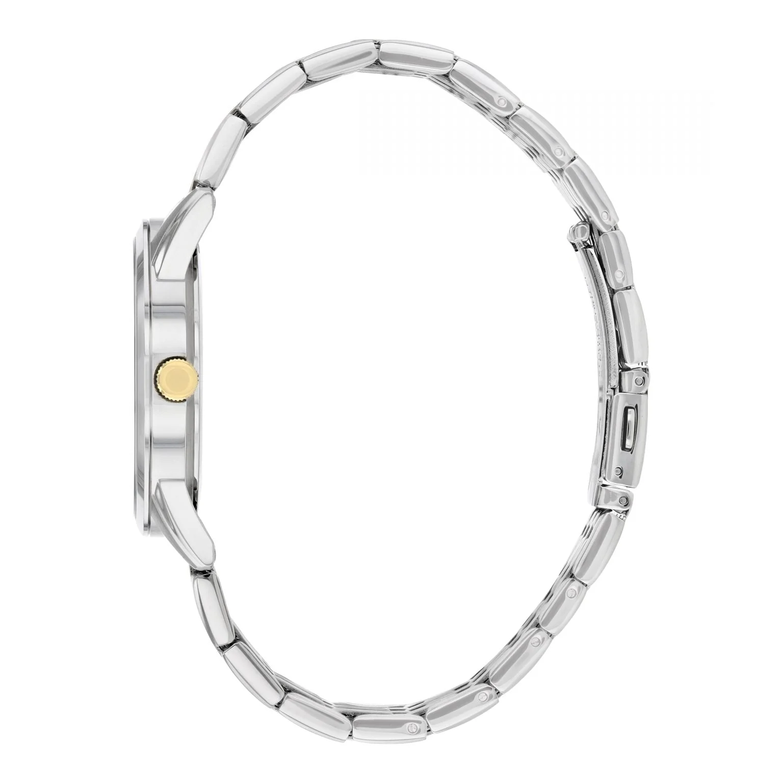 Deftly engineered with sturdy stainless steel construction, 3 year battery life and accuracy to within 20 seconds per month, this watch performs as well as it presents. Featuring a clean white face to accentuate stylish silver and gold tones, date display and sleek 39mm case, it possesses broad aesthetic appeal. Plus, with WR50/5bar and handy push button buckle, it is designed to be at once practical and efficient.