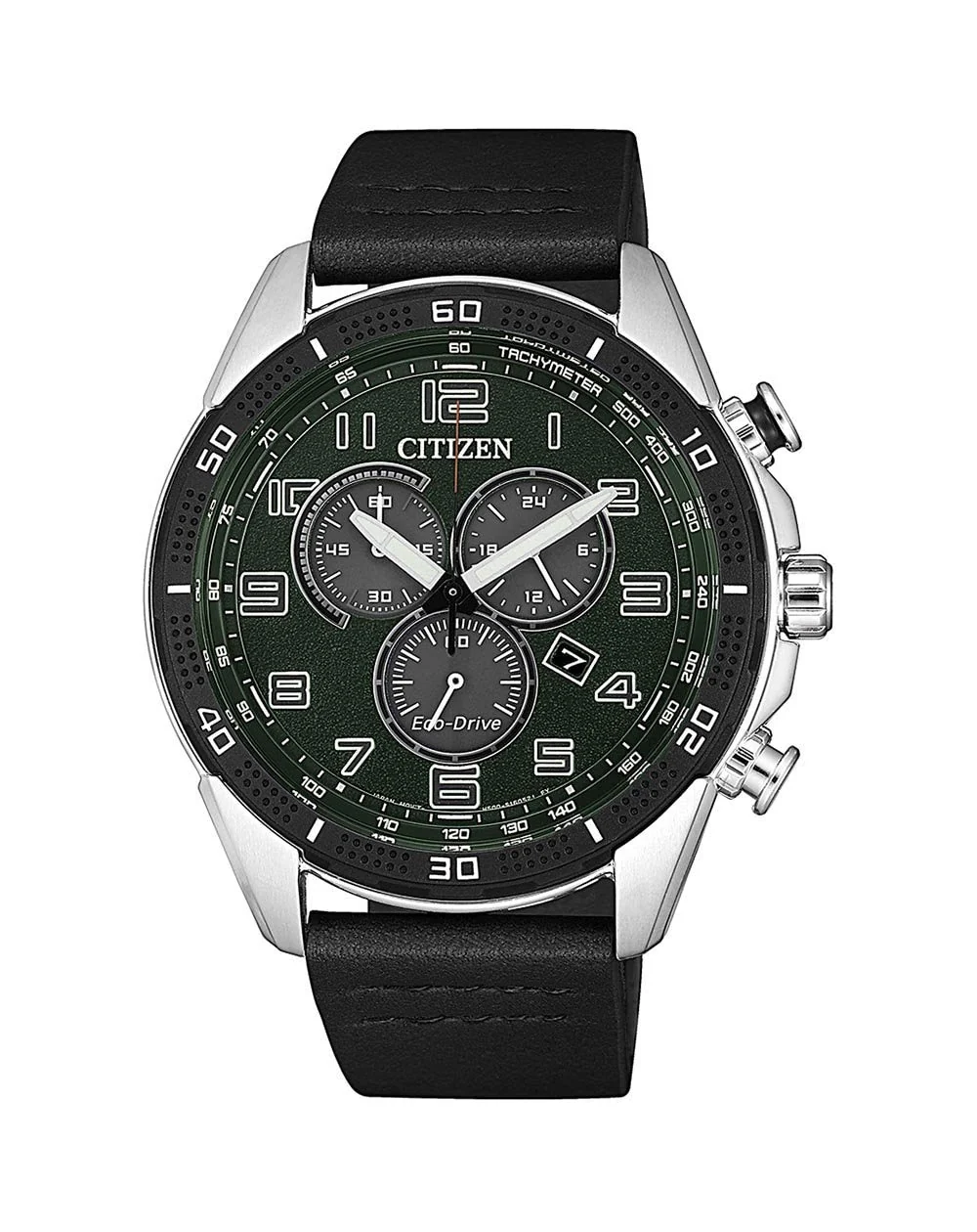 The new Drive from Citizen, a laid back feel with classic structure, instantly adding style to any wardrobe. In stainless steel case with black chroma finishing, black strap and grey green dial with chronograph and 12/24-hour time. Featuring Eco-Drive technology – powered by light, any light. Never needs a battery. Caliber number H500.