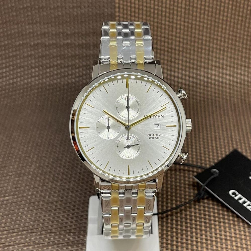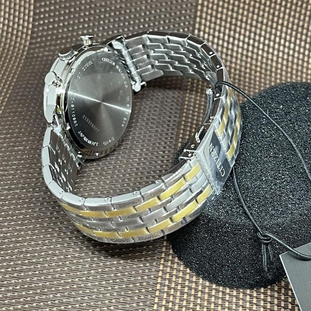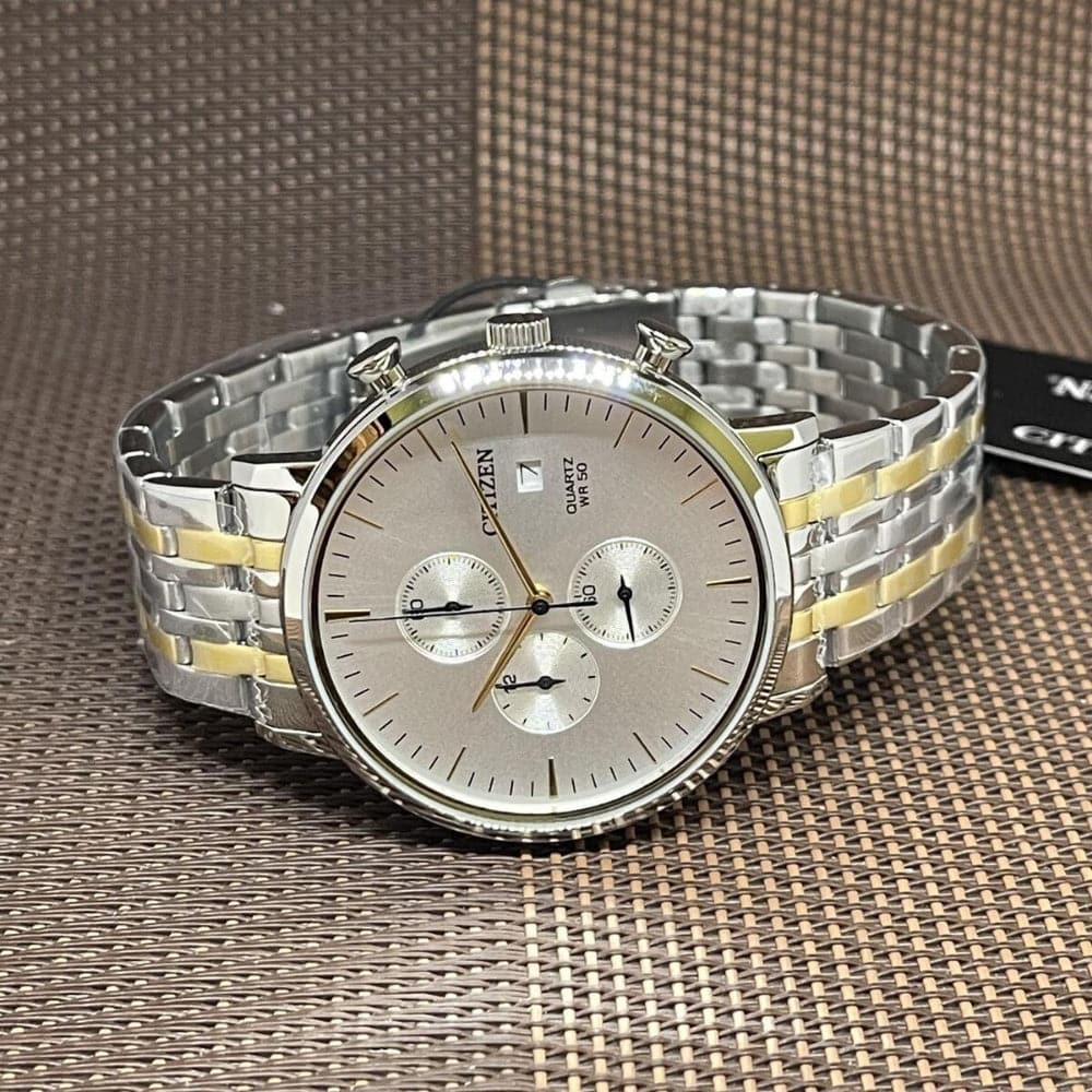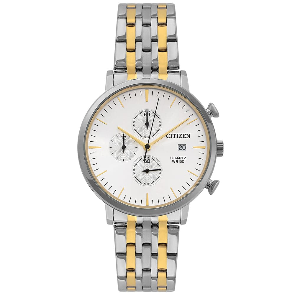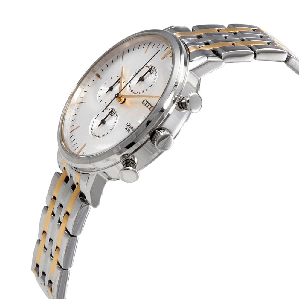 Compelling in both appearance and functionality, this Quartz watch displays discerningly cultivated style. A tasteful fusion of silver and gold punctuates the design of this watch, with easy-to-read dial featuring gold markings, silver accented bezel and gold highlights adorning the band. Adding to its captivating allure, this piece utilizes a chronograph precise to within one second for up to 12 hours to ensure your style is equally matched by performance.