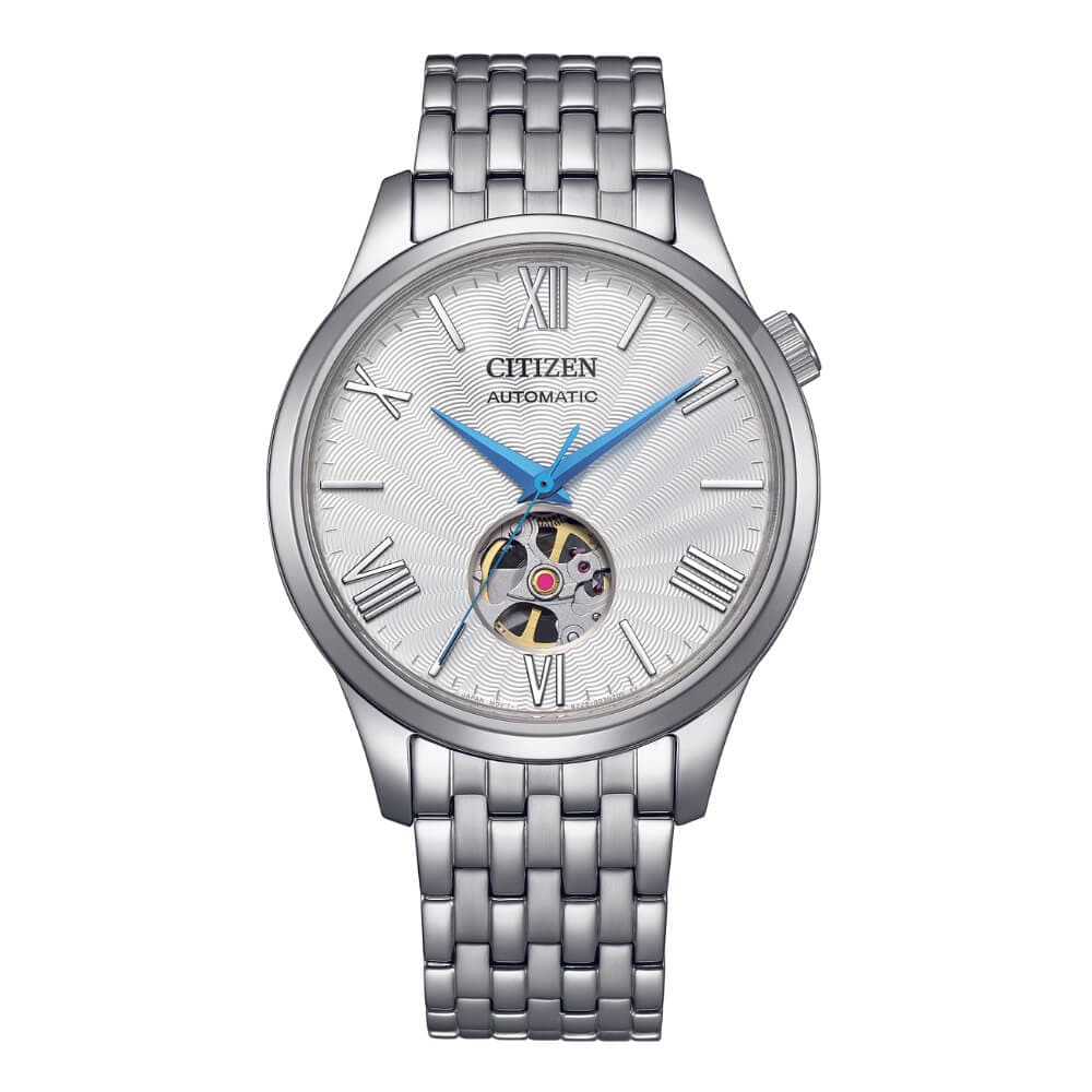 An enticing fusion of precision, durability and stylish design elements, this watch reflects meticulously considered craftsmanship in the pursuit of enduring quality. New to the Citizen Mechanical Collection, this automatic timepiece features an open heart, textured silver dial, silver markers and stunning blue hands encased in a stainless-steel case with an exhibition case back. Other notable features include a stainless-steel bracelet, a crown at 2 o’clock and water resistance of up to 50 meters. This watch is more than just a sophisticated expression of style.