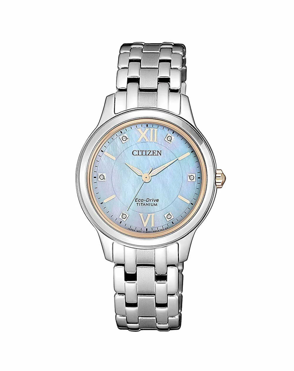At once elegantly demure and ruggedly resilient, this watch is all about versatility. With its delicately graceful powder blue mother of pearl face that features six brilliant diamonds, classic silver hued case and band and gorgeous rose gold toned bezel, it is a fashionable accessory that compliments any style. Designed as a tasteful everyday timepiece, it is built strong yet light with Super Titanium and sapphire glass to help resist scratching. Utilising any light source as power with Eco-Drive technology, it never requires batteries or charging and is accurate to within 15 seconds throughout the course of every month, so you can be confident that its performance will match its beauty.