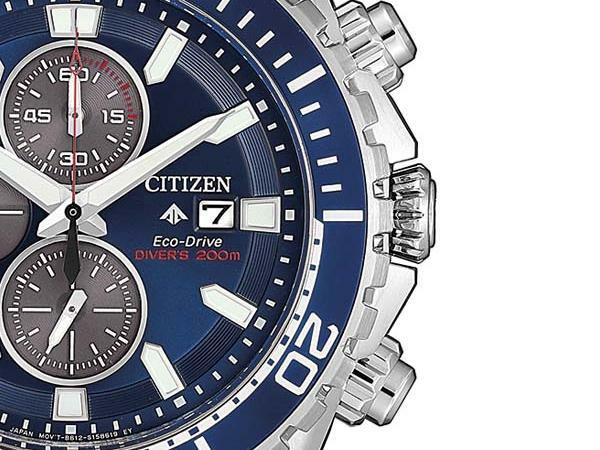 Proof that a dive watch can be fun & functional with the Citizen ISO-compliant Citizen Promaster Chrono Diver. With Eco-Drive technology, it is powered by light and never needs a battery, so you’ll never need to open your caseback or compromise your dive again. This timepiece features a stainless steel case and bracelet with blue bezel and matching blue dial, one-way rotating elapsed time, 1/5th-second chronograph, 12/24-hour time, date and diver 200M. Caliber number B612.