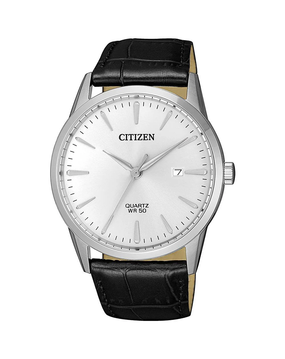 Refined, minimalist, and timeless, the Citizen Dress BI5000-10A men’s watch is crafted for those who appreciate understated sophistication. Featuring a sleek 39mm stainless steel case paired with a silver dial and protected by durable mineral crystal glass, this timepiece is powered by a reliable quartz movement. The black leather band adds a classic touch, secured with a practical push-button buckle for everyday wear. With 50 meters of water resistance and a convenient date display, it offers both function and form for any occasion. Designed within the dress and casual watch category, it stands out with a clean aesthetic and 3-year battery life—presenting a versatile style ideal for the modern man.
