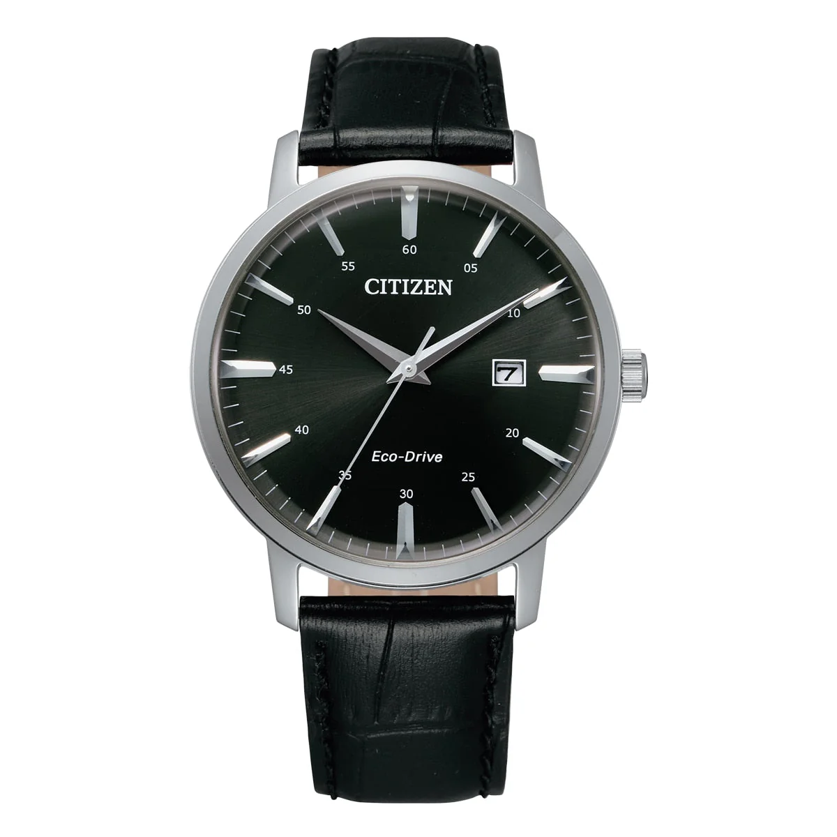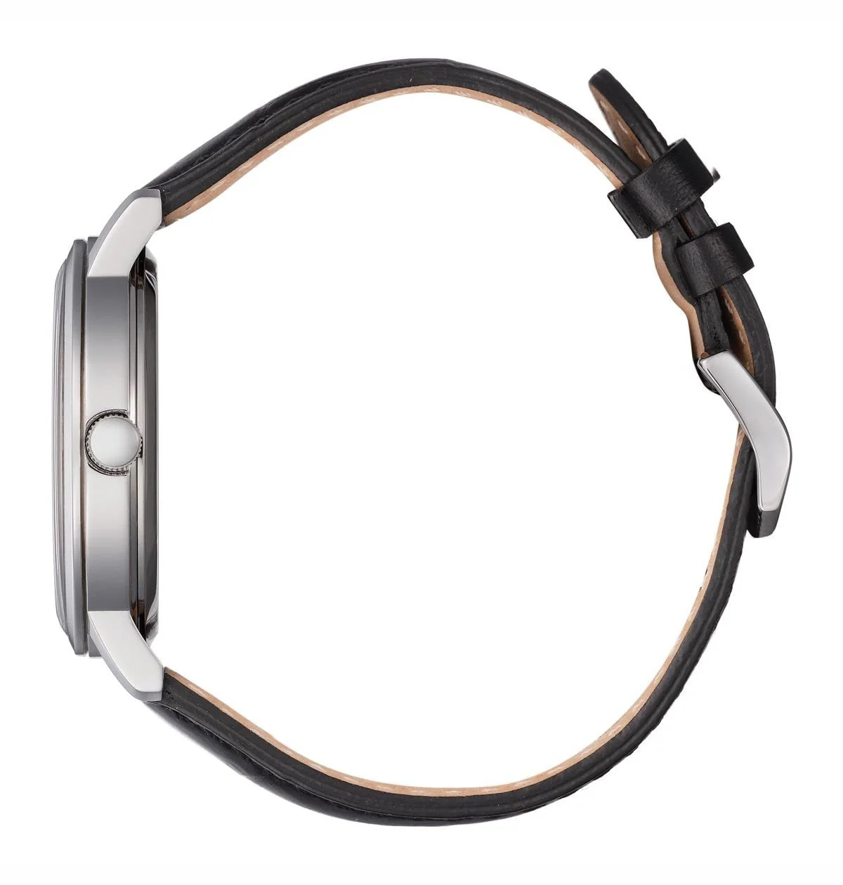A modern timepiece that displays classic aesthetic appeal. The looks of this watch are equally matched by its reliability. A smooth black sleek dial and Black oxhide leather bracelet. Features include date and low charge indicator. Powered by our Eco drive, never needs a battery, only a light source.