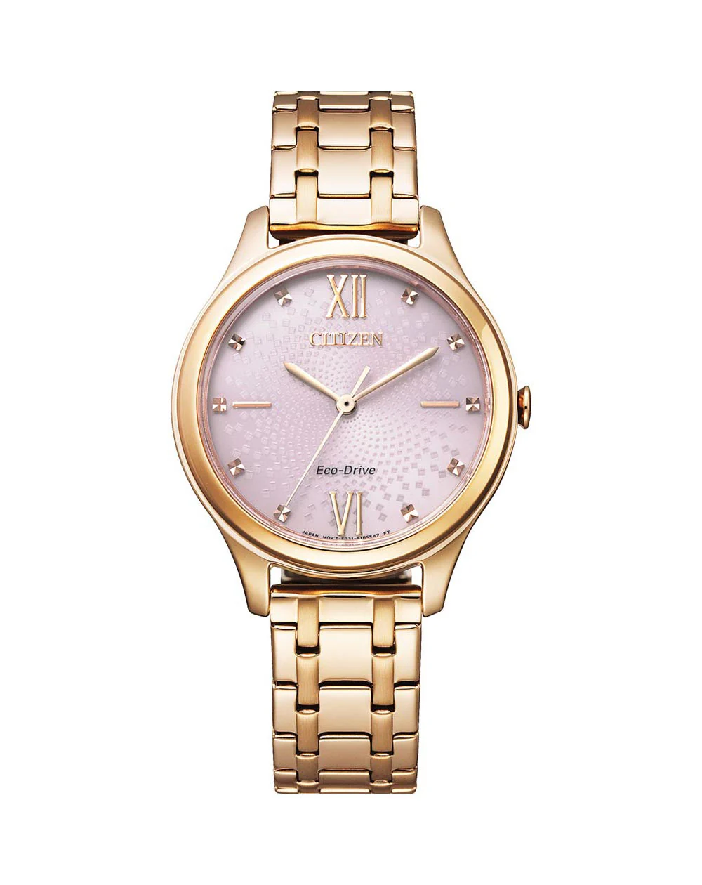 Make room in your watch collection for this stunning timepiece. A fresh staple to your every day watch wearing with clean lines and simplistic detailing. Featuring a rose gold tone dial, rose gold stainless steel case and bracelet. Powered by Eco-Drive technology, never needing a battery.
