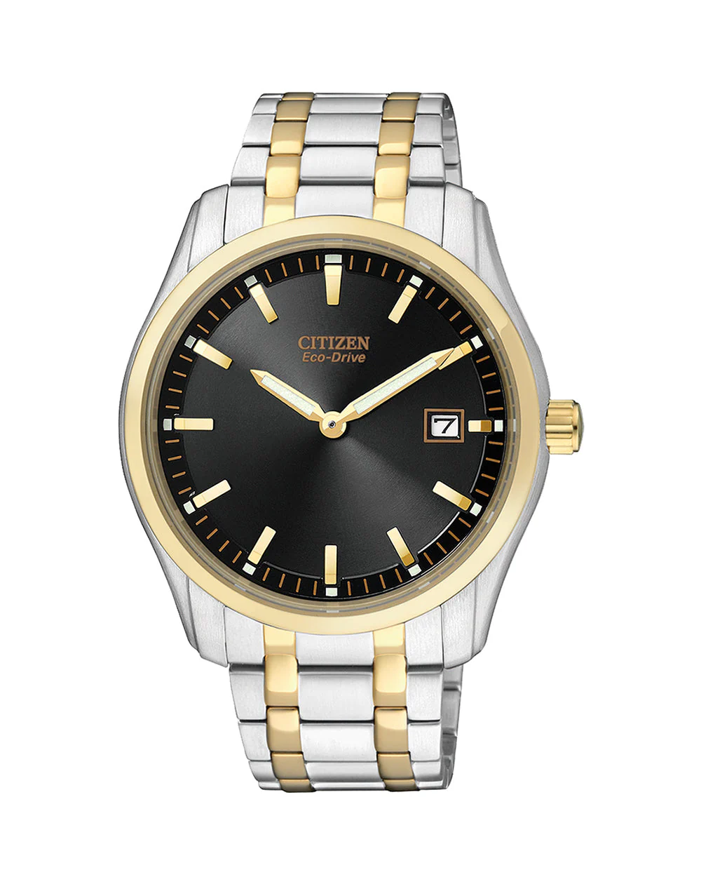 Classic dress is revisited with these new timepieces designed for the man of today. In stainless steel two-tone with a black dial and date feature. Featuring our Eco-Drive technology – powered by light, any light. Never needs to change a battery. Calibre number J165.