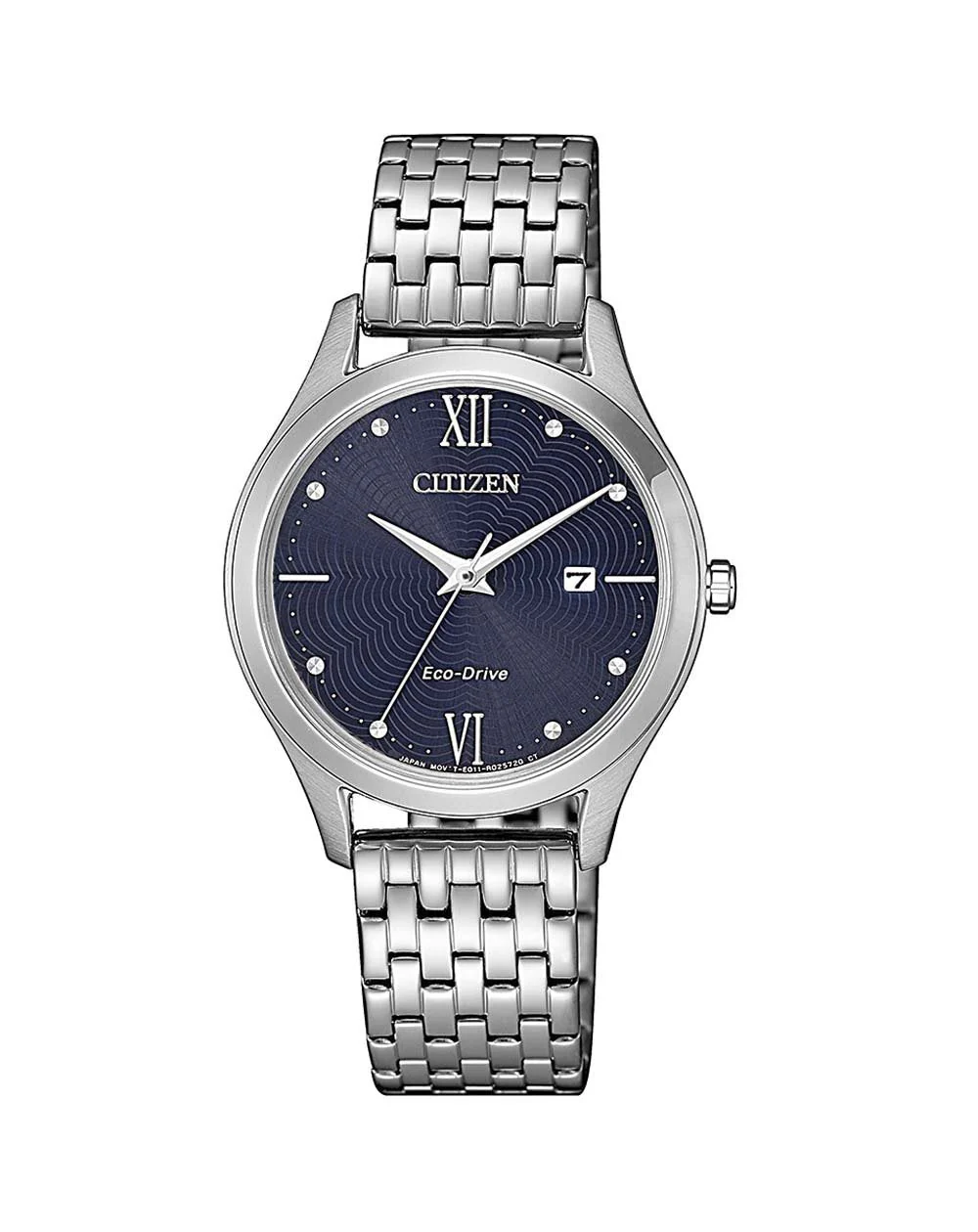 Even though it already possesses classically stylish silver highlights across the sturdy stainless steel band, case and bezel, when you look closer at this watch you will be captivated by the mesmerising aquamarine blue face with its intricate design effect inspired by the gentle ripples in a pond. Featuring date display, push button buckle and lightweight, battery free construction with Eco-Drive, it is a modestly compelling piece.