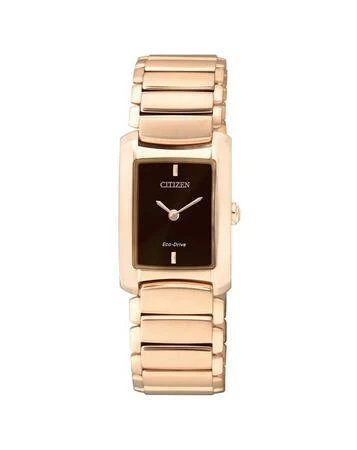 With a sleek black dial set against gold tone stainless steel case and bracelet, this watch from the Ladies Eco-Drive Collection is obtaining energy from any light source and eliminating the need for batteries. Embodies classic styling with sapphire glass with comfortable wearing push button buckle, making it a stunningly versatile piece. Caliber number G620.
