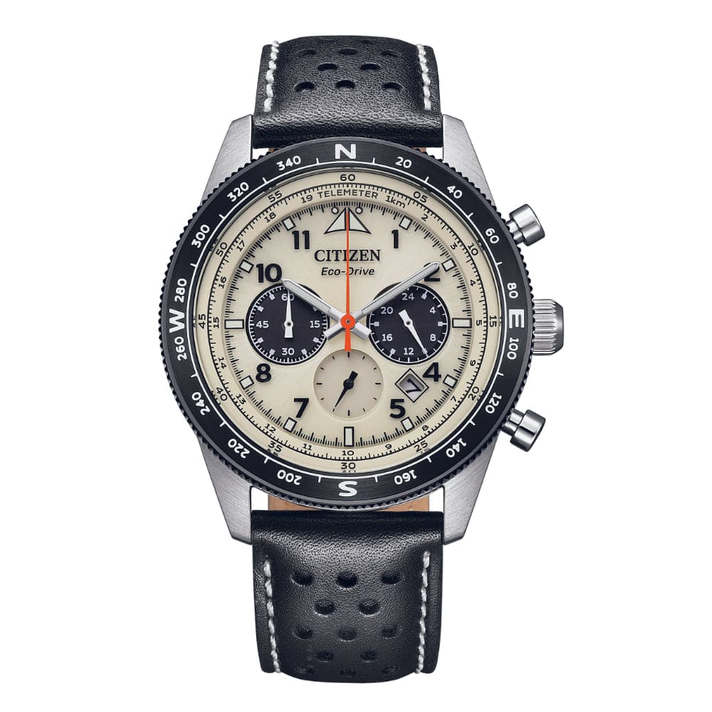Part of the Chronograph collection, this timepiece incorporates sophisticated design and precise, modern Eco-Drive technology that works just as hard as you do. This watch features a rich easy-to-read ivory dial with white & orange accents, date display, 3 sub dials and 100 meters water resistance. Additional features include mineral crystal, black & off white stainless-steel case, white accents and a leather bracelet that makes it ideal for both work and play.