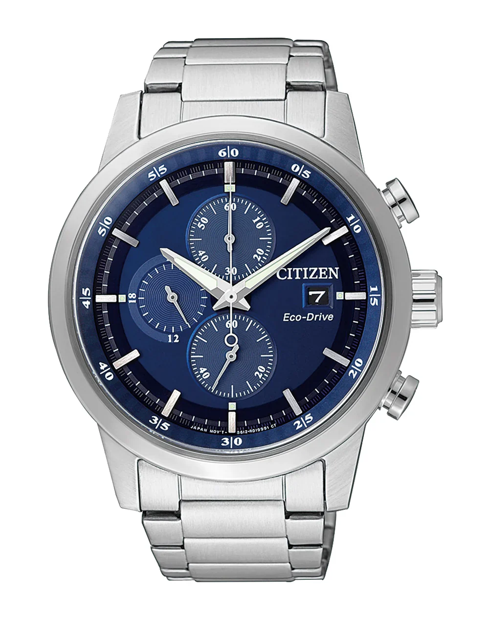 Living life in the fast lane? Compliment your style with this sporty addition to the chronograph collection. Featuring a brushed stainless-steel case, blue dial with white racing elements, silver-tone markers and white hands. Additional features include Eco-Drive technology, 6-hand and calendar movement, stainless-steel bracelet, short fold-over double-push closure, and water resistance of 50 meters.