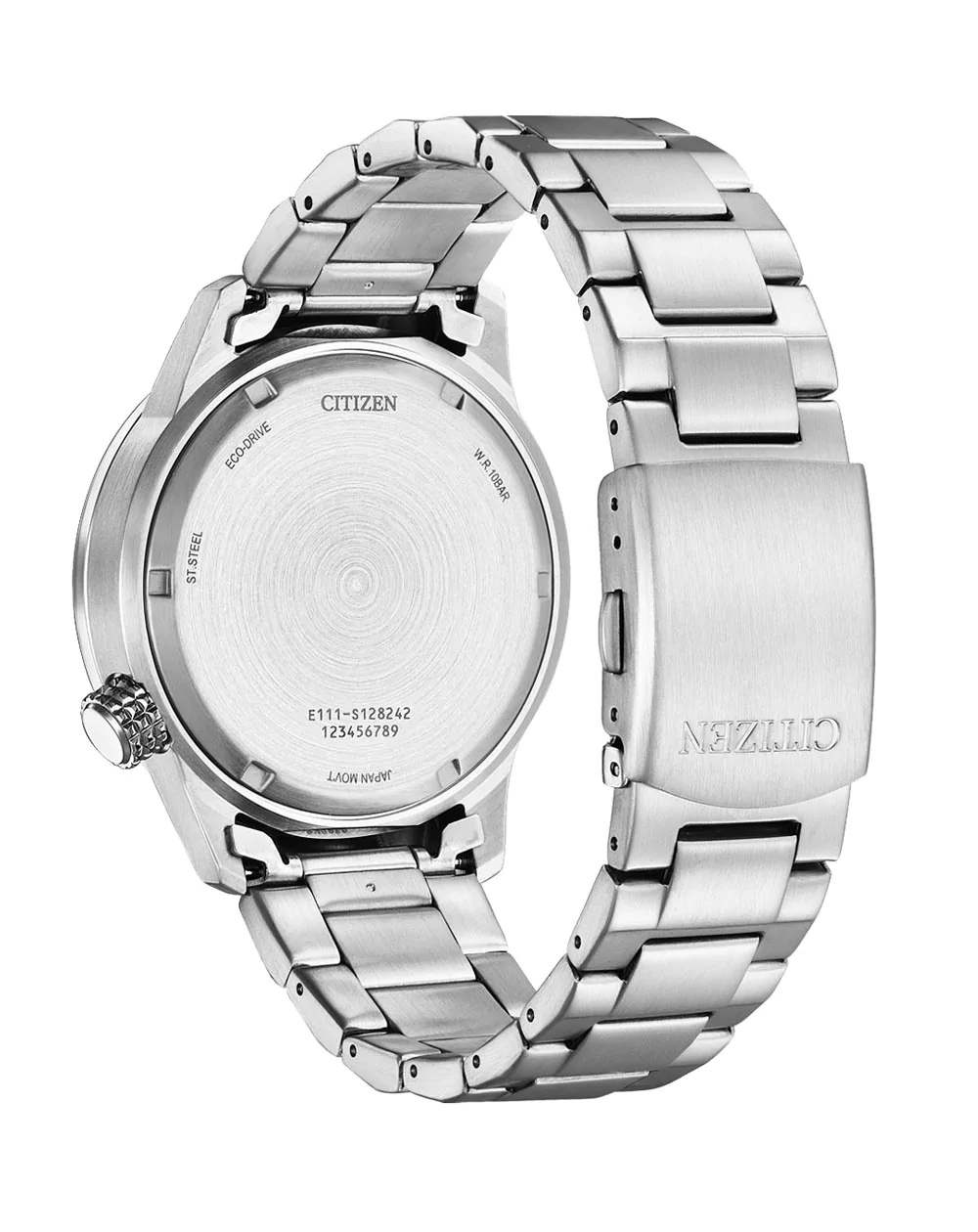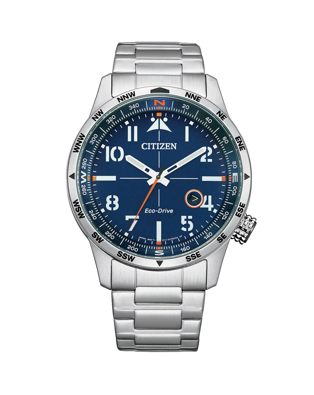 This aviator-style addition to Citizen’s Eco-Drive collection is great for work and everyday wear. This watch features a brushed stainless-steel case and compass-inspired blue dial with iconic crosshair design, bold luminous markers, and white and yellow hands for enhanced visibility. Additional features include a stainless-steel bracelet, short fold-over double-push closure, and water resistance of 100 meters.