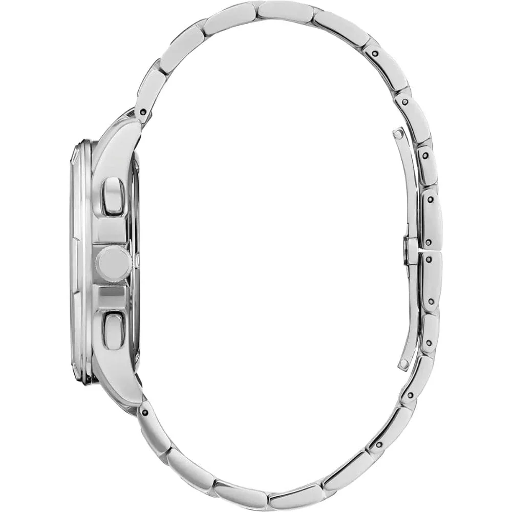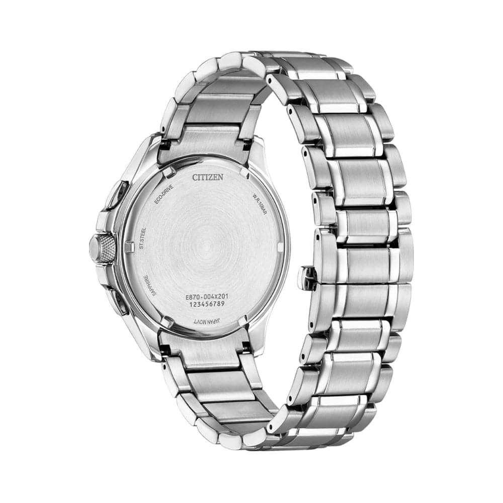 Designed to make a statement. This perpetual calendar boasts dual time and 1. 5 years power reserve. Featuring an ultra smooth blue dial with hints of silver, sapphire glass and a push button buckle. Never be late with day/date, alarm and month. Also featuring Eco drive technology, powered by light, any light. Never needs a battery.
