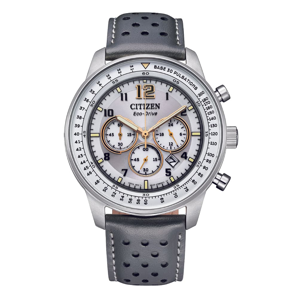 This heritage-inspired timepiece is an extension of the Chronograph range. This multigenerational chronograph features an array of aviation level functionality such as Eco-Drive technology that ensures your watch never loses power, a thin bezel with a wide dial for better visibility and luminous markings. Armed with base 30 pulsations for high accuracy heart rate count. This method is one which is used medically to measure heart rates both quickly and accurately. Start counting the heart rate for 30 beats from the 12 hour marker. When you reach 30, where the second hand points is the heart rate. Additional features include a 6-hand movement and date, 12/24 hour time, grey dial, stainless-steel case, grey leather strap and water resistance of 100 meters.