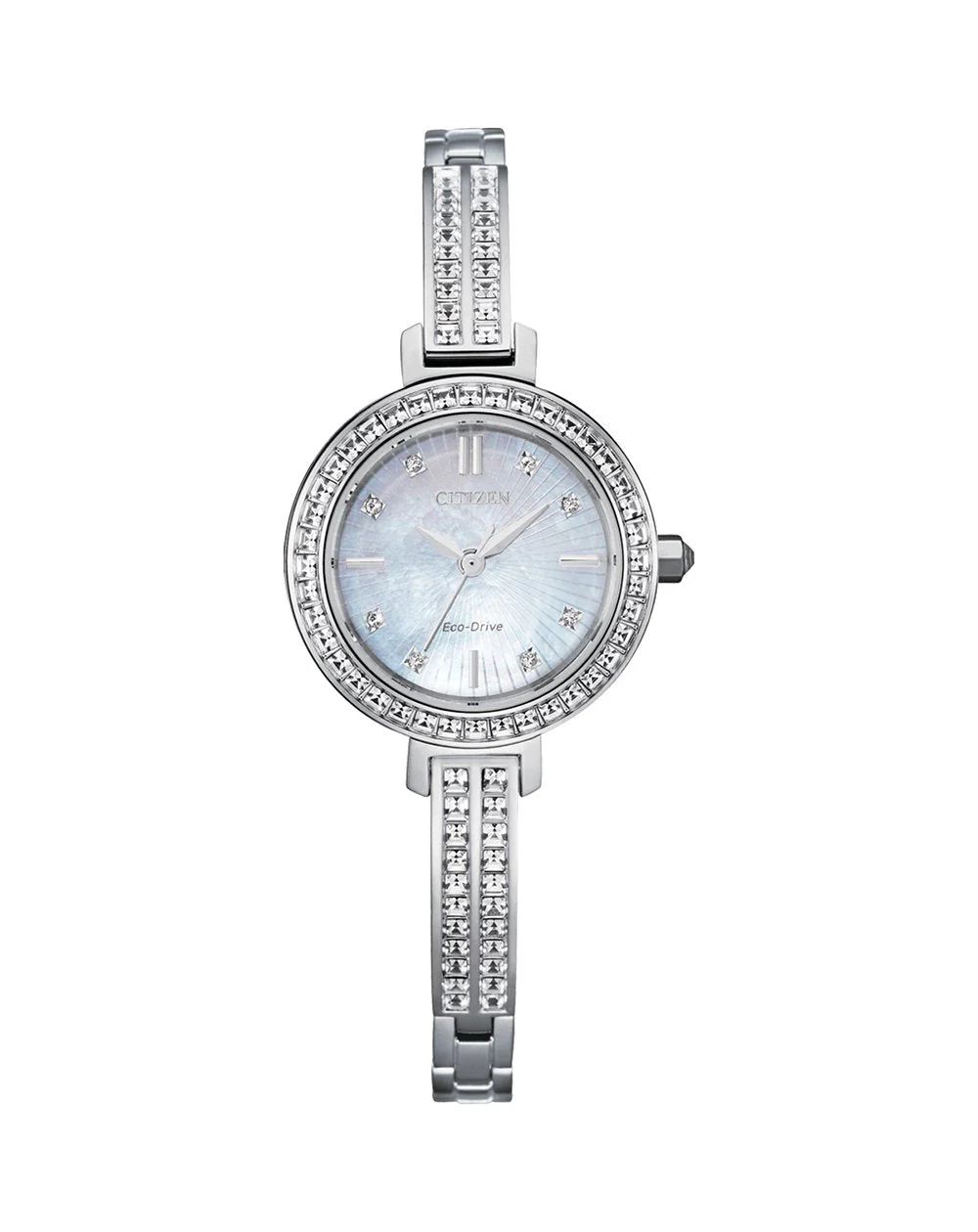 The stand out glittering appeal of this ladies watch will surely garner many a compliment. The delicate profile is accentuated by the sun-ray patterned mother of pearl dial and the striking bracelet and bezel. With its endless sparkle, this watch is boldly feminine and an exquisite addition to your jewellery and watch collection. Featuring a solid stainless steel bracelet and 25mm stainless steel case. With functionality to match its style, this piece is equipped with Eco-Drive technology and water resistance to 50 meters, perfect for still water swimming.