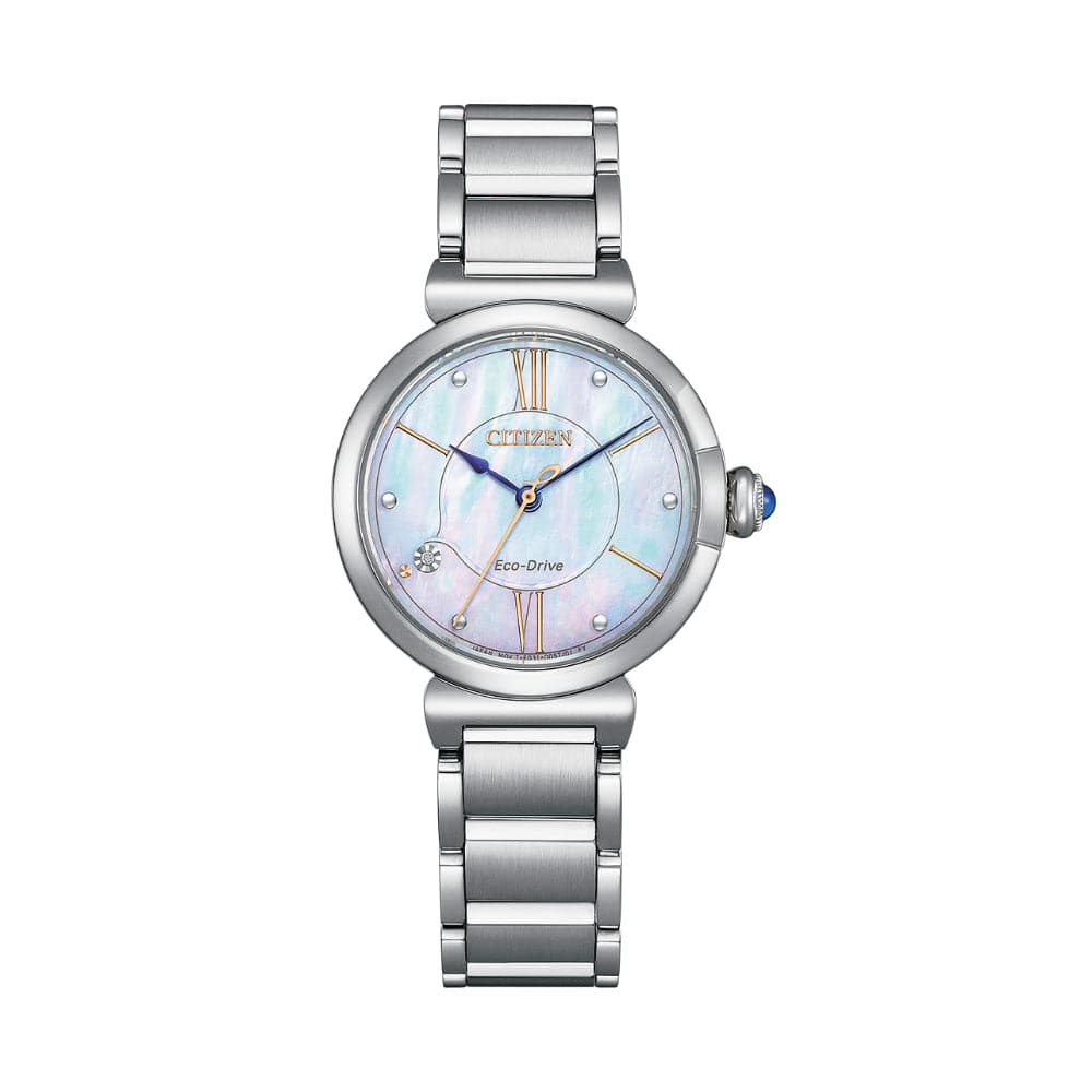Classic lines and hints of romance make this newest piece to our ladies’ collection, the Citizen L May bells, a glamorous addition of sustainable luxury. With a case design inspired by May bells featuring the curved, sleek lines of the flowers, the bezel shape has a distinct feature at the 3 o’clock position, where the crown resembles an elegant perfume stopper. Featuring a white, mother-of-pearl dial made of recycled materials, including a recycled polycarbonate base under the dial, and showcased on a sleek, silver-tone stainless steel case and bracelet. The dial also has a diamond that gives focus to the 8 o’clock position and is finished with a sapphire crystal. Sustainably powered by any light with our proprietary Eco-Drive technology that never needs a battery, this elegant women’s watch is the perfect dressed up look with high-powered performance. Caliber E031.