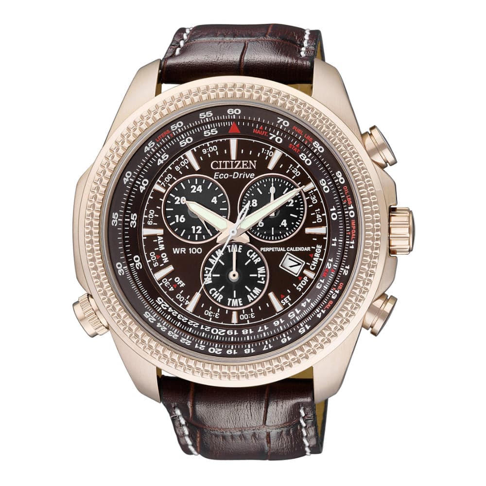 Boldly daring, this sporty watch conveys maximum info at a glance. This 1/20 second Chrono measures to 60 minutes, with Perpetual Calendar, 12/24 Hour Time, Dual time, Alarm, and Rotating inner ring. Features include a rich brown dial and oversized 48mm Stainless Steel Rose Gold-tone case with Screw-back and is 100M WR. Powered by Eco-Drive- the revolutionary light powered movement from Citizen, this watch has the ability to continuously recharge in any light source and can run for a minimum of six months even in the dark without any charge. This revolutionary earth friendly technology eliminates the need to change battery frequently and gives you hassle free timekeeping, never disappointing you when you need it the most. The Eco-Drive movement also comes with built-in Insufficient Charge Warning Function and Overcharge Prevention Function.