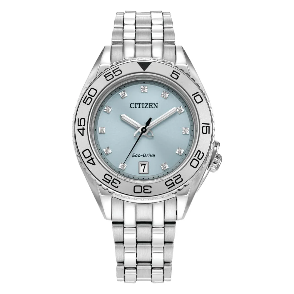 When sporty style meets luxury. This women’s timepiece is designed to be versatile yet elevated and features a silver-tone stainless steel case and bracelet with a light blue 3-hand dial with 11 diamond accents and a sapphire crystal, date function and a deployment clasp with push buttons for easy accessibility. Water resistant to 100 meters and sustainably powered by light with Eco-Drive and never needs a battery