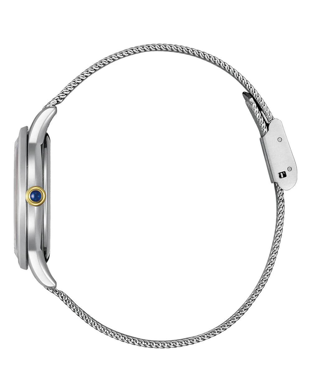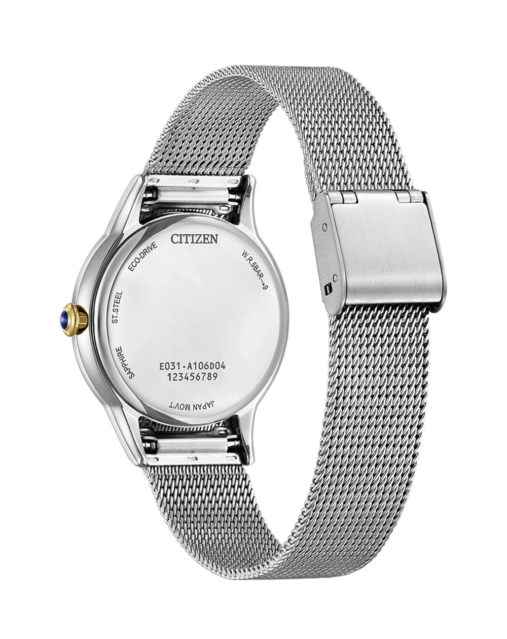 Citizen’s EM0814-83A watch offers the perfect blend of style and sustainability. Made with eco-friendly stainless steel and featuring a sleek white dial, this timepiece keeps you on track with its reliable Eco-Drive technology. Stay on trend while making a positive impact on the environment with this expertly crafted watch.