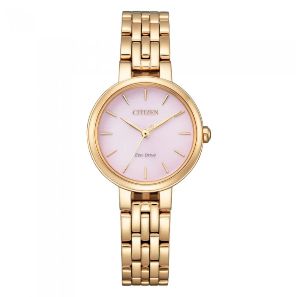 CITIZEN L offers elegant and feminine designs inspired by the beauty of nature include ethically obtained materials and commitments to people and society worldwide. By introduction of Eco-Drive power source that uses light to power watches and does not require battery replacement. CITIZEN L watches aim to create a more sustainable future by using sustainable materials that deliver beauty and functionality without sacrificing the wellbeing of others. Effortlessly sophisticated. A comfortable fit like a loosely worn bracelet for this new CITIZEN L watch. Featured with pink dial, rose gold stainless steel case and bracelet.