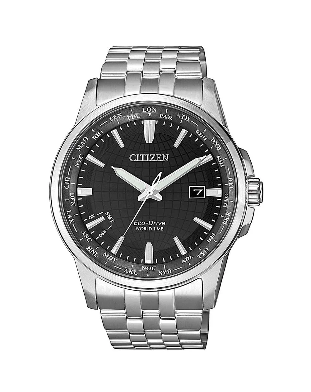 Refined and stylish in both looks and functionality, this watch is ideal for men who value quality and precision. With its subtle globe design on an ebony toned face with white markings and classic silver toned case and band, it keeps you looking sharp whether you’re in a business meeting or catching up with friends. Featuring Perpetual Calendar technology, it automatically updates at the conclusion of each month – including those in a leap year – so you don’t have to spend your time adjusting it. Using Eco-Drive to obtain power from any light source, you never have to worry about buying and replacing batteries, and with world time spanning 26 cities, it is designed as a functional accessory for a modern lifestyle wherever you may find yourself.