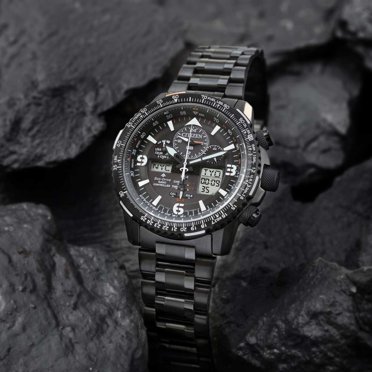Introducing the Citizen ProMaster Black Skyhawk Professional Master Watch JY8085-81E, an expertly crafted timepiece inspiring precision and power. Featuring atomic timekeeping for 43 cities, a perpetual calendar, dual time, alarms, countdown timer, digital backlight, and UTC display, powered by Citizen’s Eco-Drive technology and rechargeable in any light source, this watch is a must-have for the discerning professional. A bold black ion-plated stainless steel case and bracelet, black dial, bright orange details, and unique case and dial motifs make this a statement-making accessory. Make your time matter.